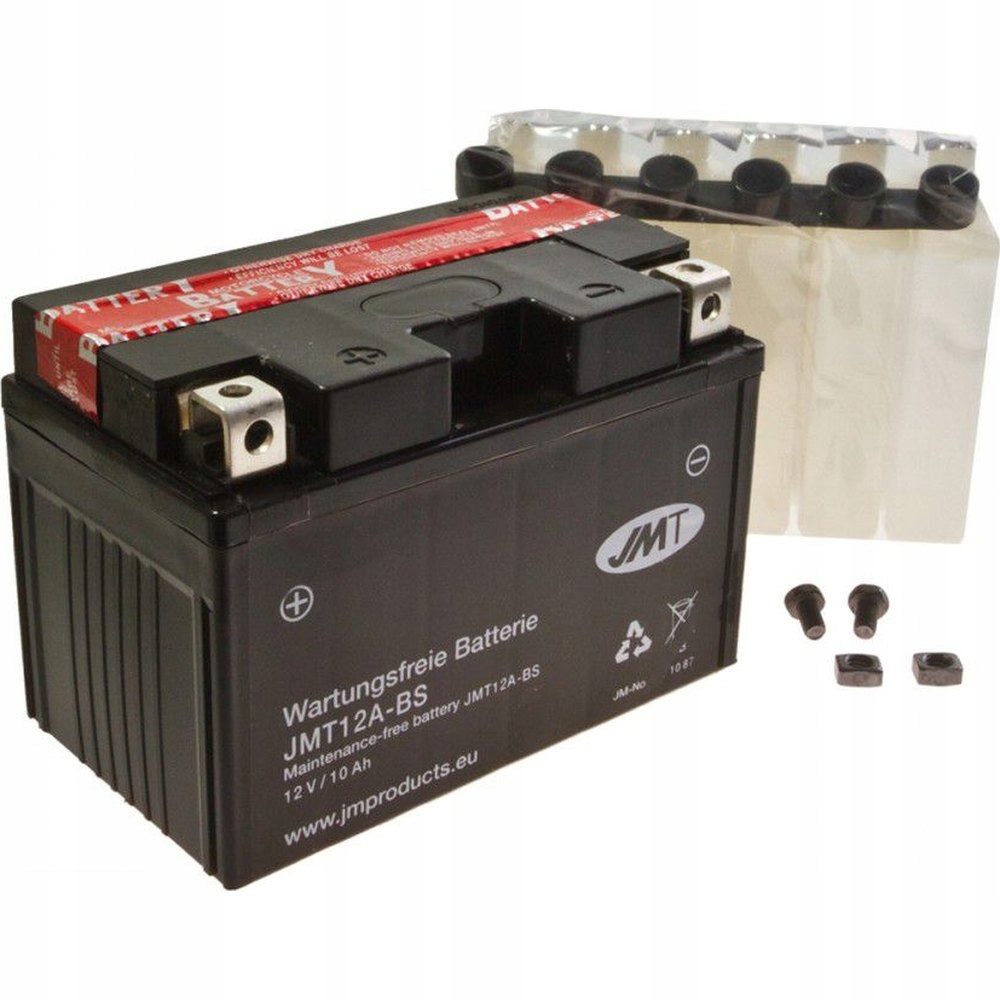 Акумулятор, що постачається з електролітним бака. Він не був активований, і після затоплення його електролітом слід додати відповідно до показань, описаних нижче. За останні кілька років акумулятори JMT повністю змінили обличчя. Завдяки використанню повністю автоматизованої виробничої лінії, в даний час виробляються акумулятори JMT, представляють найвищий глобальний технологічний рівень. Відносно низька ціна означає, що акумулятори JMT є найкращим рішенням на ринку мотоциклістів. Рівень заряду можна перевірити альтернативно за допомогою метра напруги. Якщо це 6,1 В (6 В акумулятор) або 12,2 В (12 В акумулятор), акумулятор повинен бути наповнений рівним або менше 1/10 ємності акумулятора. Приклад: акумулятор 8AH повинен бути заряджений значенням 0,8 a.