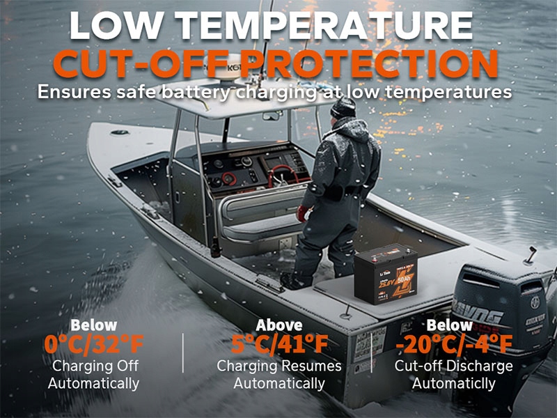Завдяки захисту від відключення при низькій температурі літієва батарея LiTime 24V 25Ah тролінгового двигуна призупиняє заряджання при температурі нижче 32℉, припиняє розряджатися при температурі нижче -4℉ та безпечно відновлює роботу при температурі вище 5℉. Це може захистити вашу батарею від пошкодження холодом, тому ви можете зосередитися на риболовлі, а не на умовах.
