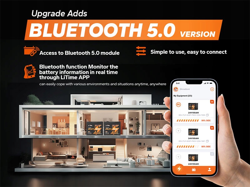 Завдяки вбудованому Bluetooth 5.0 батарея тролінгового двигуна LiTime 24 В 50 Ач дозволяє контролювати стан батареї та системи в режимі реального часу за допомогою програми LiTime. Легко перевіряйте напругу, стан заряду, температуру тощо – будь-коли та будь-де. Незалежно від того, керуєте ви окремим пристроєм чи повним налаштуванням, ви залишатиметеся в курсі та контролюєте лише одним дотиком телефону.