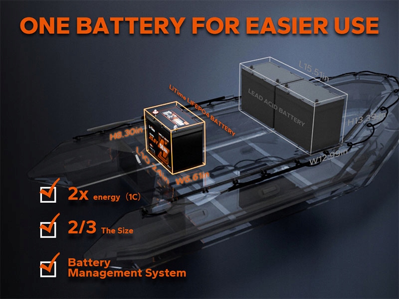 Отримайте ефективність двох свинцево-кислотних акумуляторів 12 В 50 А·год в одній компактній літієвій батареї 24 В 50 А·год. Завдяки вдвічі більшій корисній енергії та розміру лише на 2/3 його легше встановлювати, легше переносити та ідеально підходить для тісних місць, як-от човни, без шкоди для потужності.