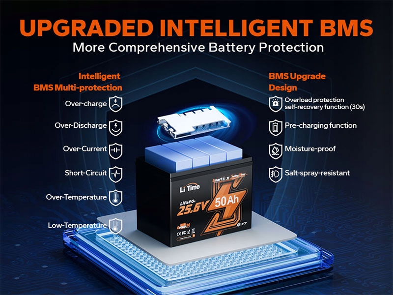 Більше, ніж просто стандартний захист, оновлена та власноруч розроблена BMS додає розширені функції, такі як відключення при низькій температурі, автоматичне відновлення після захисту від перевантаження, підтримка попереднього заряджання та стійкість до вологи та солі. Окрім основних засобів захисту, таких як захист від перезаряду, короткого замикання та перегріву, ця інтелектуальна система гарантує, що батарея залишається безпечною, стабільною та надійною – навіть у найсуворіших умовах.