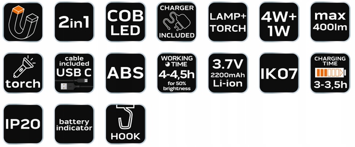 Акумуляторна лампа для майстерні 400 лм COB + ліхтарик 99-102 NEO потужністю 4 Вт, включаючи фронтальний ліхтарик 1 Вт.