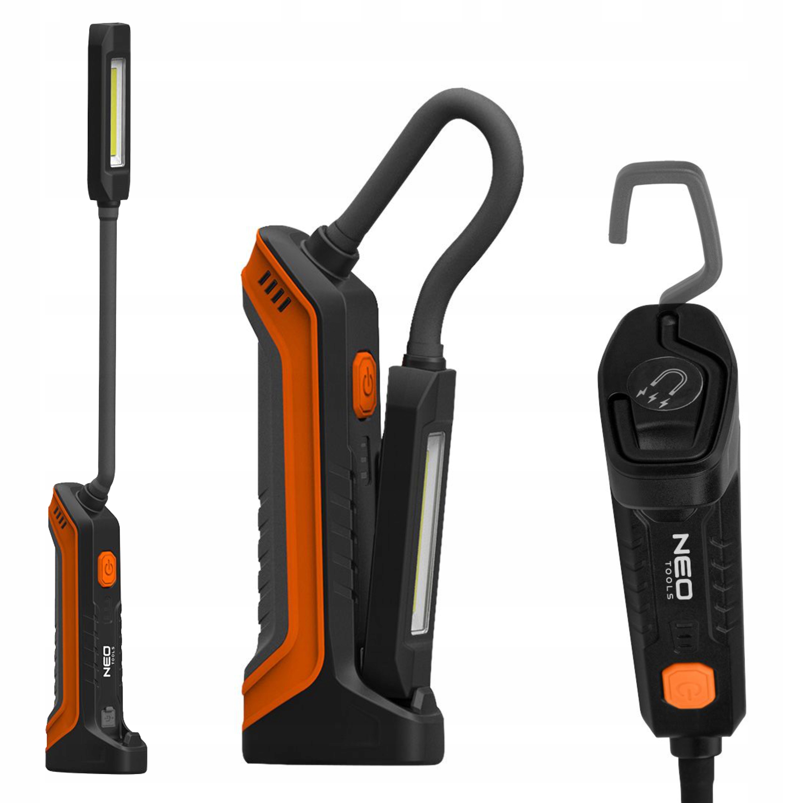 Лампа має індикатор заряду акумулятора. Час роботи при 50% яскравості становить приблизно 4-4,5 години, 2-2,5 години для 100% яскравості та 9-10 годин для ліхтарика. Для повної зарядки пристрою потрібно 3,5 години. У набір входить практичний зарядний пристрій 5 В постійного струму 1 А. Магніт в основі ліхтарика і гачок для підвішування полегшують його розміщення під час роботи. Лампа для майстерні з гнучкою головкою від бренду NEO — продукт із багатьма застосуваннями не лише для ентузіастів DIY.