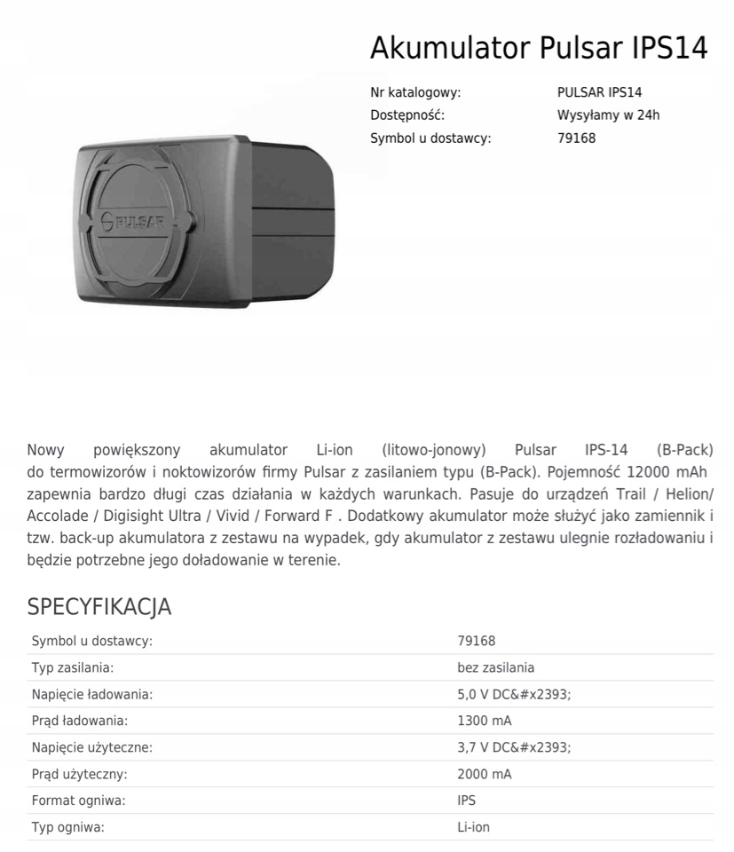 Просматривая «Акумулятор Pulsar IPS14 Trail Helion Accolade IPS 14 Battery Store Варшава», вы можете быть уверены, что данный товар из каталога «Ночного видения» будет доставлен из Польши и проверен на целостность. В цене товара, указанной на сайте, учтена доставка из Польши. Внимание!!! Товары для Евросоюза, согласно законодательству стран Евросоюза, могут отличаться упаковкой или наполнением.