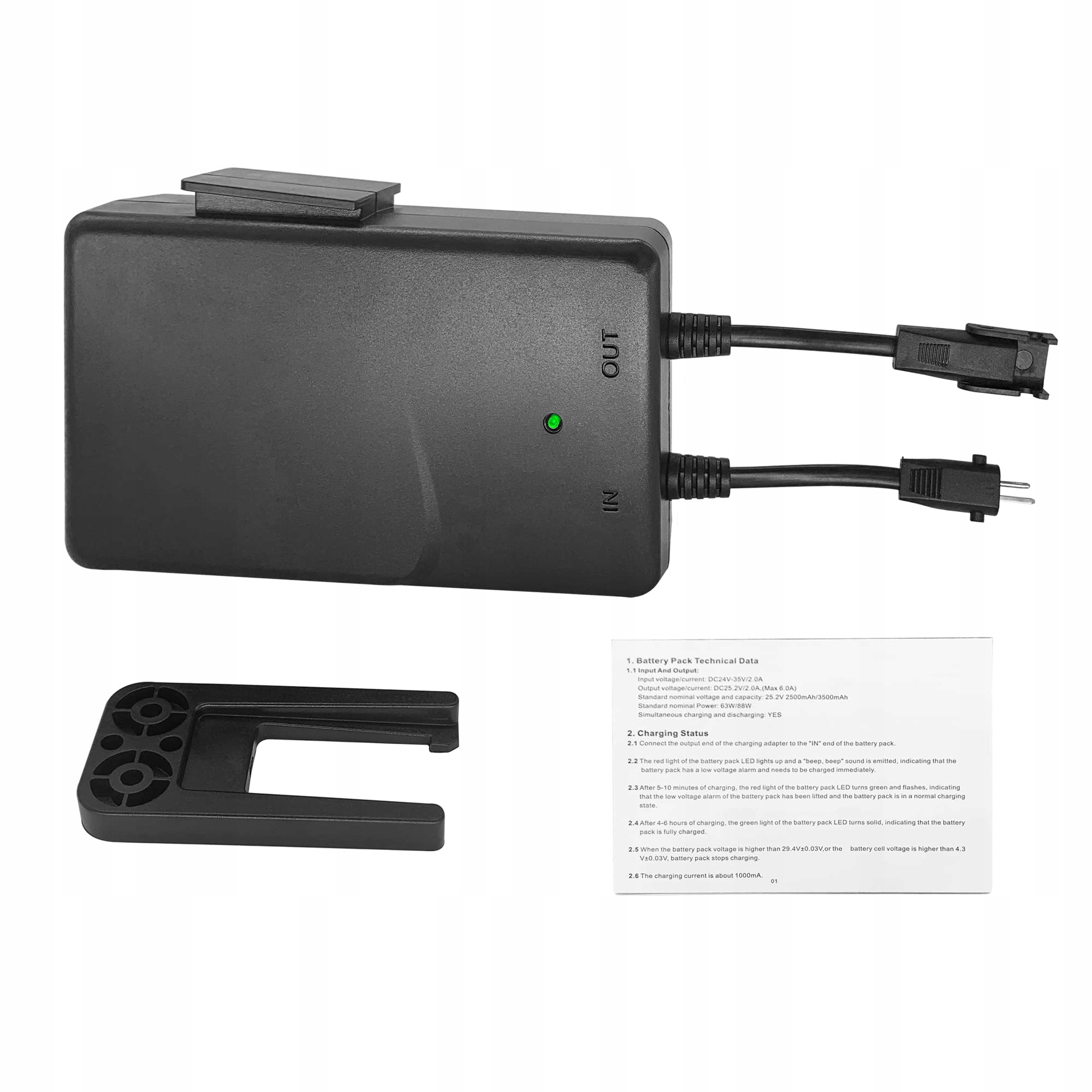 - Тип акумулятора: літій-іонний акумулятор для багаторазової зарядки. Напруга: Вхід: 24V-35V постійного струму/1,8-2a. Вихід: 25,9 В, 2,5А, 64,75WH
