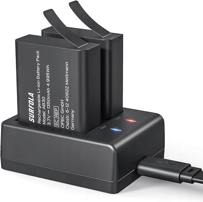 Акумулятор Surfola Action Cam ємністю 1350 мАг (2 шт.), із зарядним пристроєм із двома портами USB, сумісний із акумуляторами для спортивних камер Apexcam/Rollei