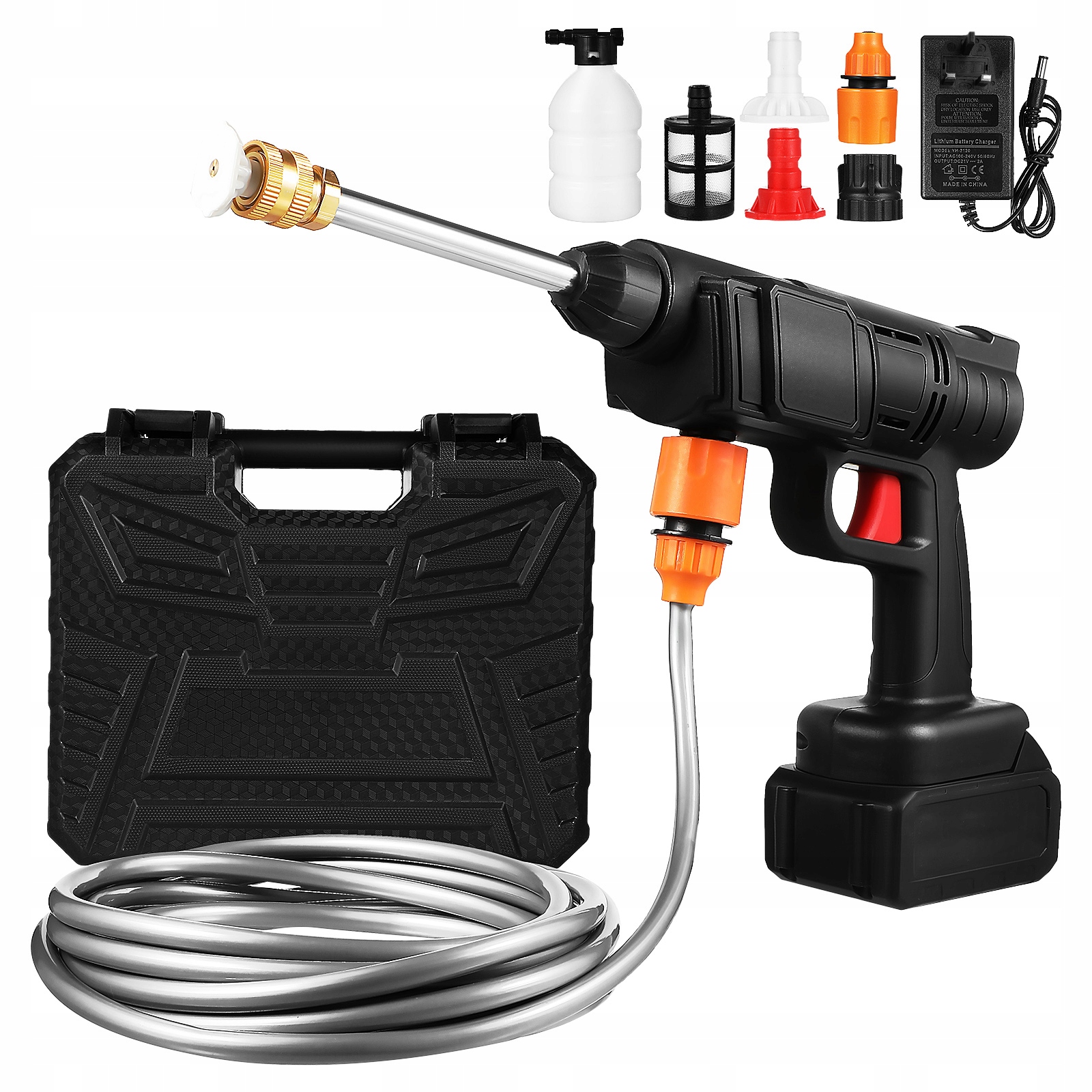 ✅ 1 x мийка високого тиску, 1 x подовжувач, 1 x шланг, 2 x розпилювачі, 1 x фільтр, 1 x з’єднувач, 1 x чайник, 2 x батареї, 1 x зарядний адаптер