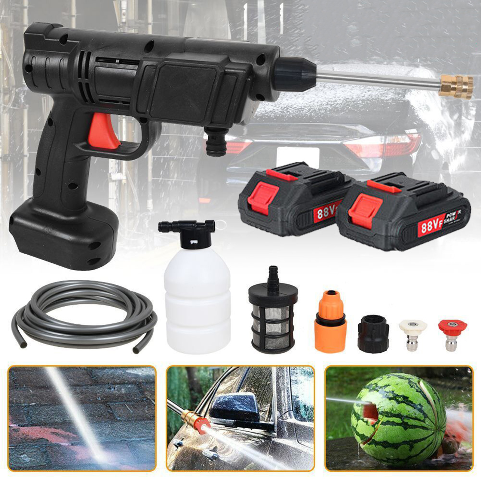 - Пістолет для миття автомобіля, що живиться від літієвих батарей із 2 батареями. Максимальна потужність 1500 Вт.