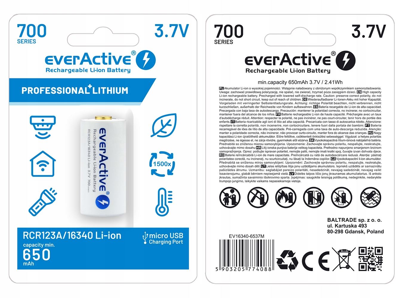Акумулятор 16340 everActive має вбудований електронний захист. Його розміри та номінальна напруга точно такі ж, як і у звичайної літієвої батареї CR123, тому її можна замінити прямо!