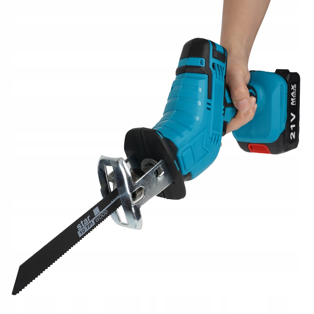Акумуляторна шабельна пила з акумулятором і зарядним пристроєм, загалом два різних типи полотен для пилки по дереву (10TPI*2, 6TPI*4) і 2 пилки по металу. Виберіть пильний диск відповідних параметрів, який можна використовувати для різання дерева, металу, ПВХ труб тощо.