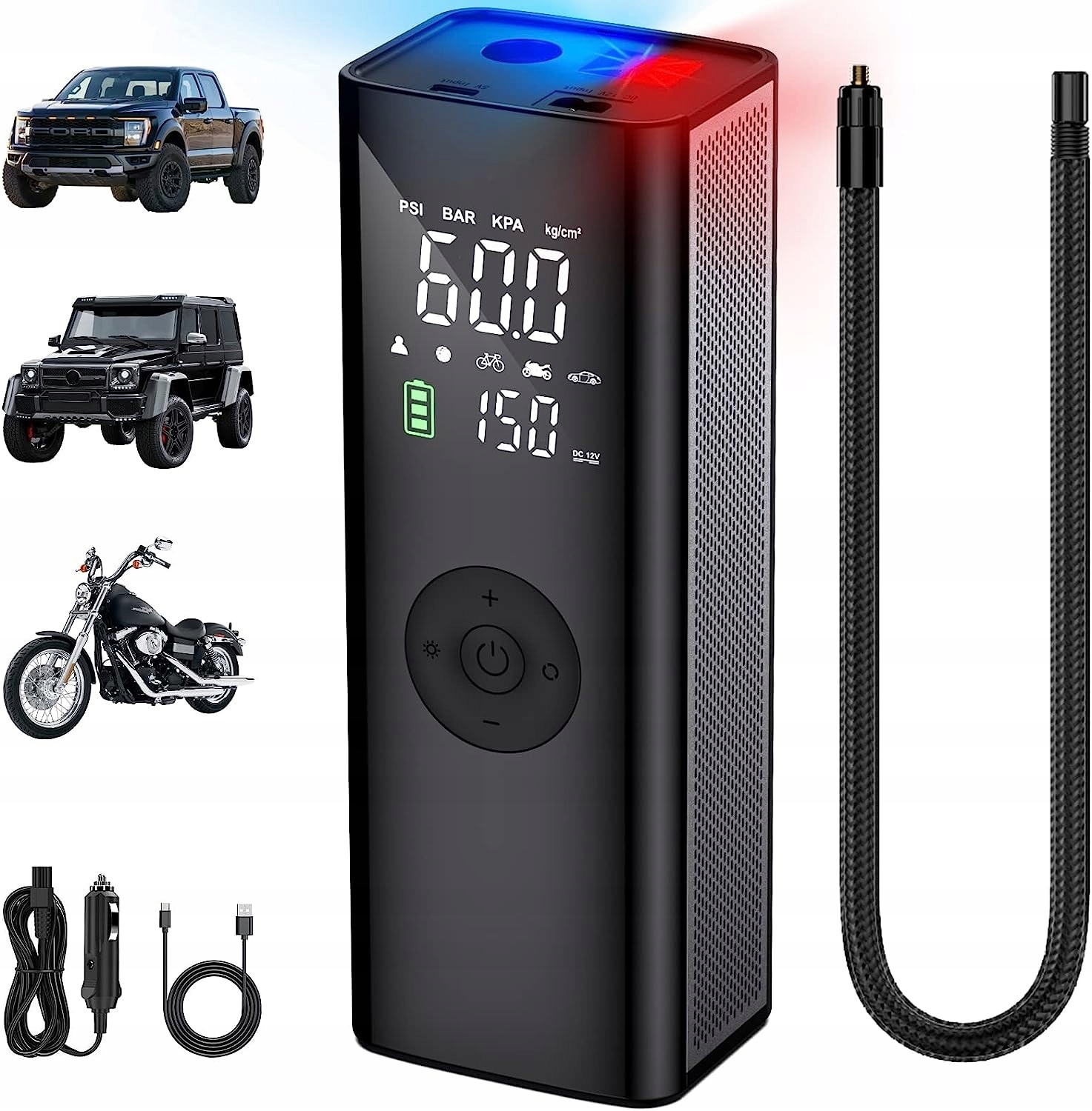 Просте у використанні, швидке надування та автоматична зупинка, ідеально підходить для накачування позашляховиків, автомобілів, мотоциклів, велосипедів, м’ячів, плавальних кілець тощо надувні автомобілі.
