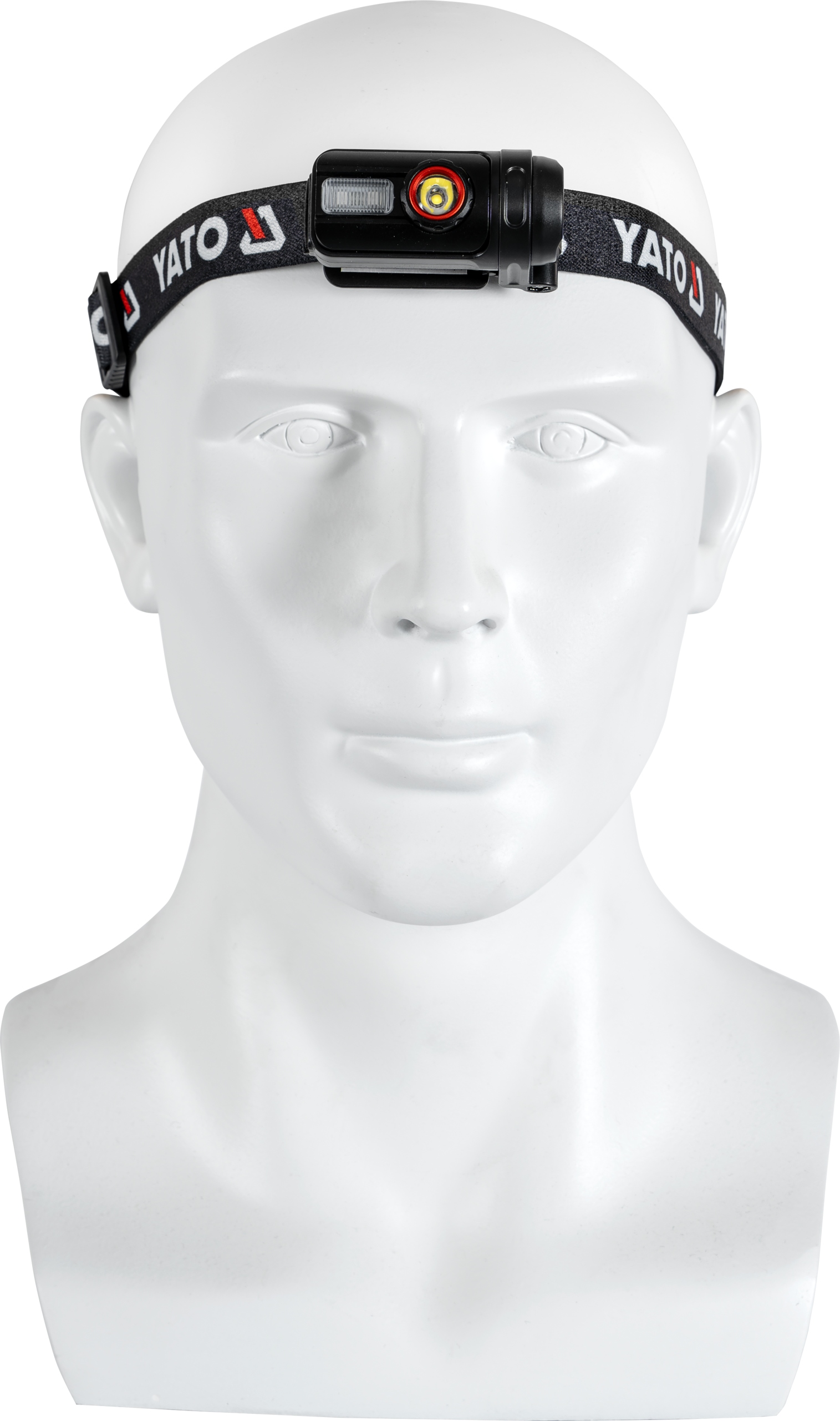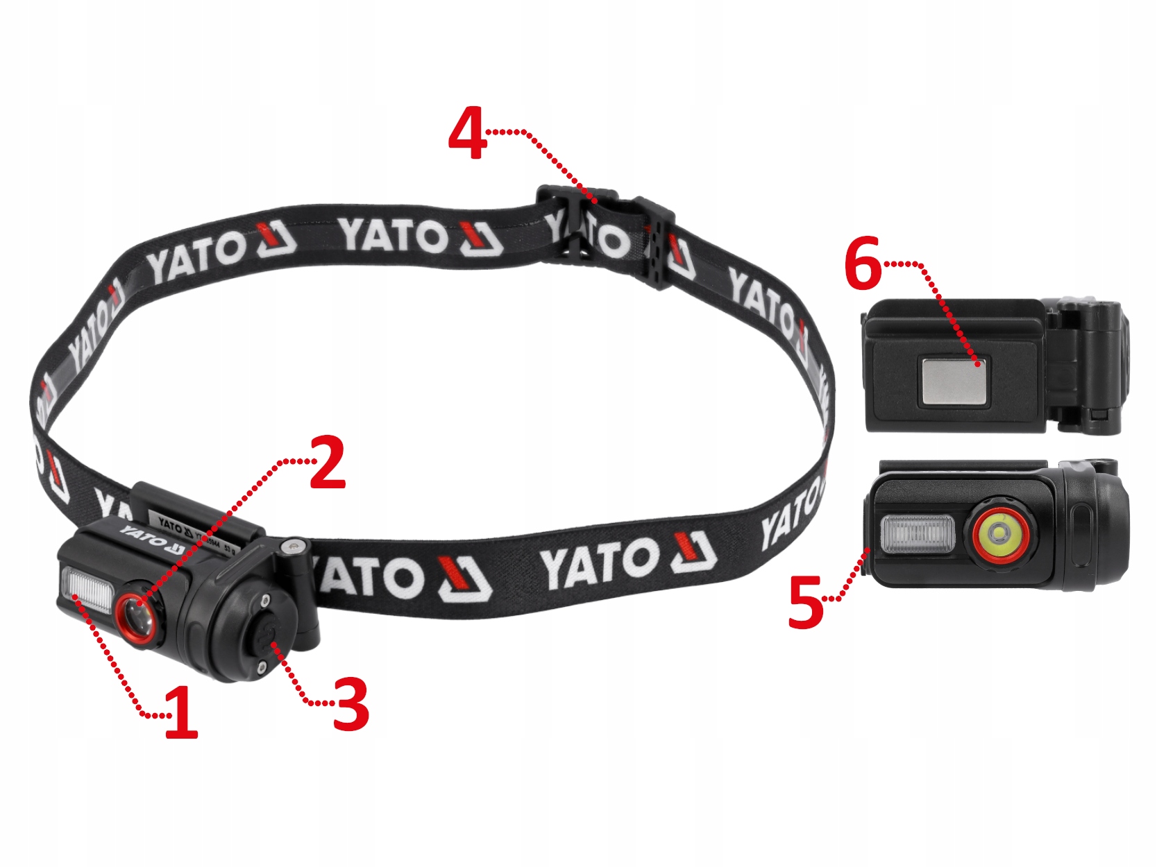 Акумуляторний налобний ліхтар YATO з червоно-білим світлом і шістьма режимами роботи, що дозволяє регулювати освітлення під різні умови та виконувану діяльність.