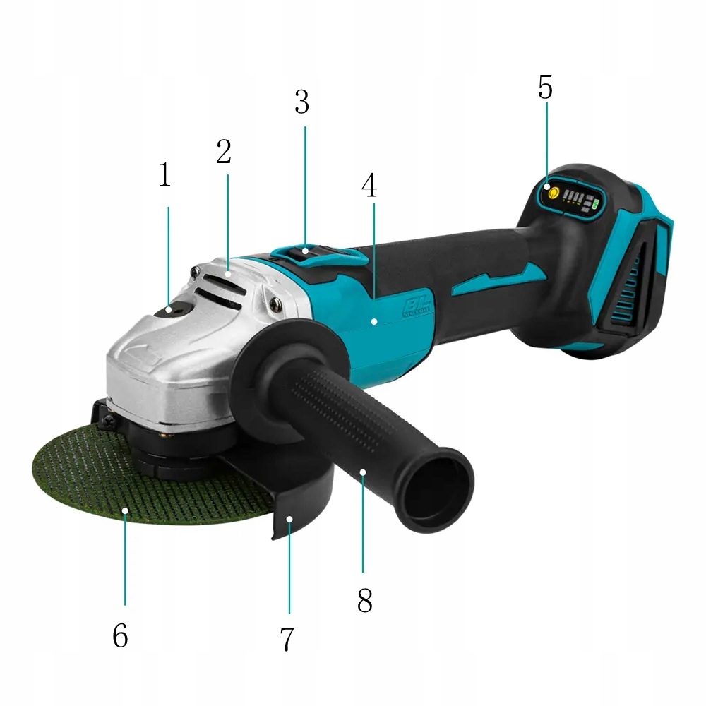 інтелектуальний : інтелектуальний дисплей, відображення помилок машини в режимі реального часу. Невелика ручка, легка, менша під час роботи на вулиці. (Примітка: кутова шліфувальна машина постачається без акумуляторів. Цей продукт може бути адаптований до акумуляторних акумуляторів 18 В)