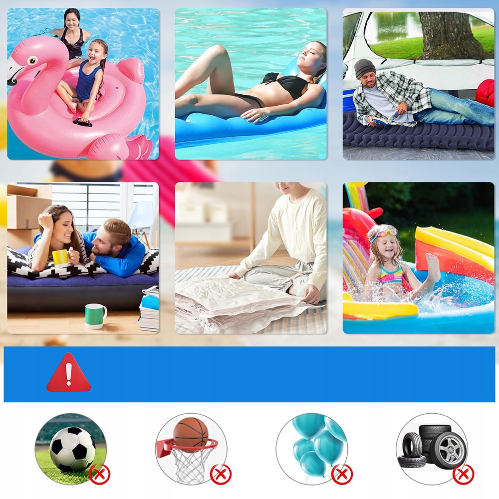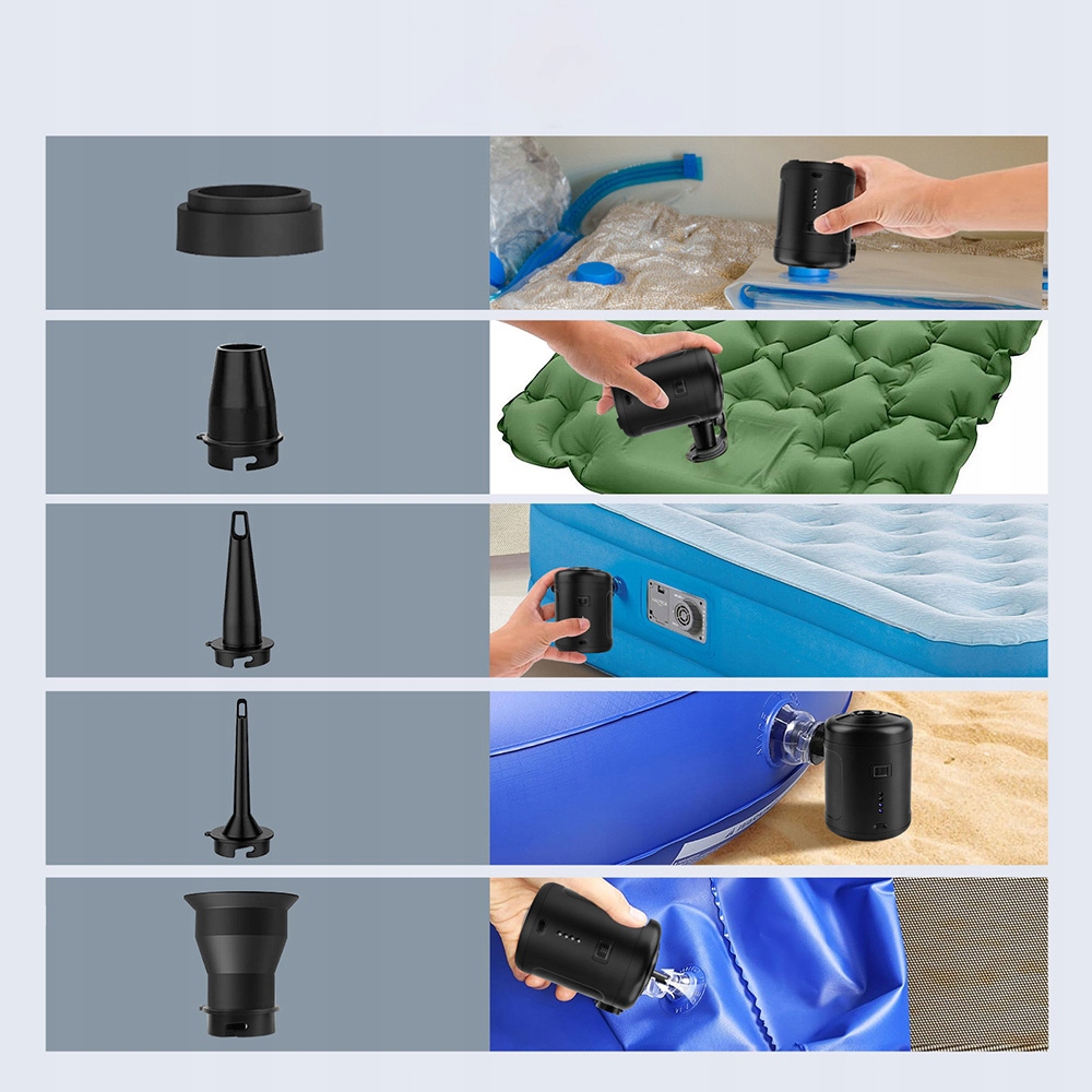 - 【5 багатофункціональних насадок】: електричний повітряний насос постачається з 5 різними типами насадок для задоволення різних потреб у накачуванні. Ідеально підходить для кемпінгових матраців, надувних човнів, надувних басейнів, надувних матраців для басейнів, дитячих басейнів та інших надувних об'єктів. Його також можна використовувати для видалення зайвого повітря з вакуумних пакетів.