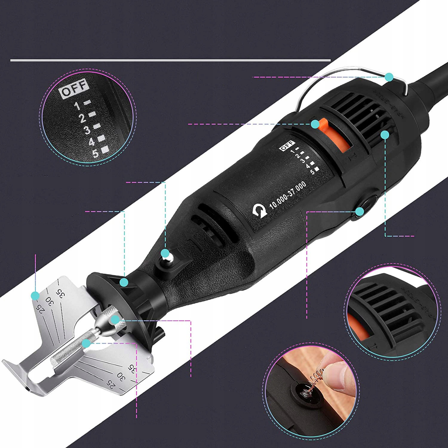- ⚡ Потужний двигун на 180 Вт + 5-ступінчасте регулювання: Наточіть тупі ланцюги бензопил за кілька хвилин. Оснащений потужним двигуном 180 Вт, він підтримує 5 налаштувань швидкості в діапазоні 8000-35000 об/хв (10000-37000 об/хв без навантаження). Висока потужність і гнучкий контроль швидкості дозволяють швидко заточити тупі ланцюги бензопил, значно заощаджуючи час і зусилля порівняно з ручним заточуванням.