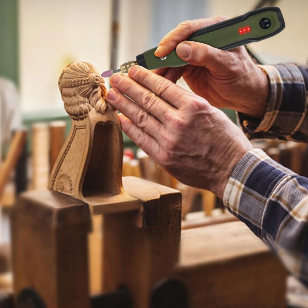 ⚙️Легкий і компактний дизайн ручки для гравіювання полегшує її перенесення. Нековзка ручка забезпечує додатковий комфорт і стабільне керування. Дизайн кнопки живлення дозволяє не хвилюватися про те, що випадково торкнеться перемикача, щоб зупинити обертовий інструмент.