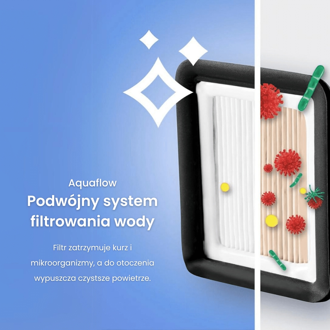 - Подвійна система фільтрації води: фільтр ефективно вловлює пил та інші мікроорганізми, випускаючи чистіше повітря в навколишнє середовище.