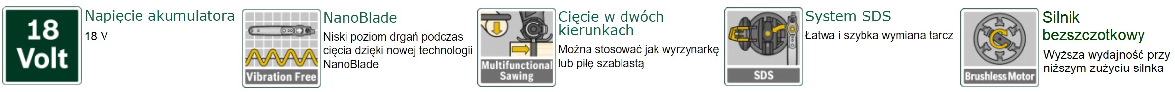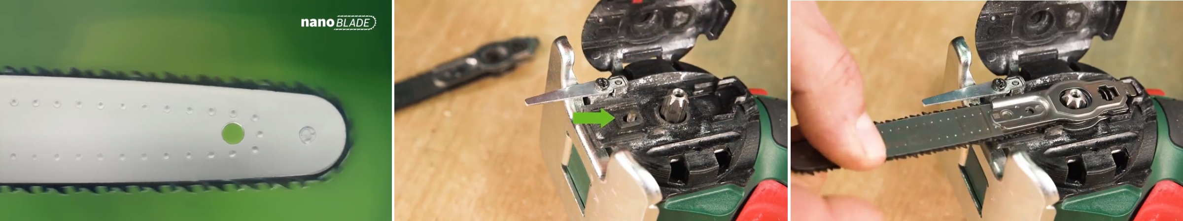 - Нова технологія різання NanoBlade повністю не вимагає технічного обслуговування, не потребує змащування чи заточування пилкового полотна