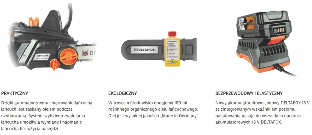 пила, акумулятор 4Ah 18V зі світлодіодним керуванням, швидкий електронний зарядний пристрій, шина та ланцюг OREGON, кришка шини, пляшка з маслом, оригінально упакована з інструкцією PL.