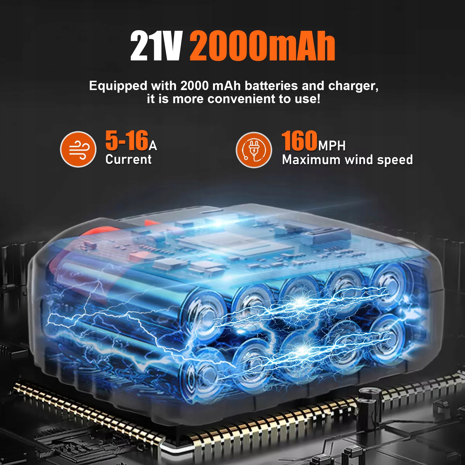 ⭐Можливість працювати від 2 акумуляторів і швидкої зарядки: Акумуляторна повітродувка оснащена 2 акумуляторами 21В і швидкісним зарядним пристроєм, який може безперервно працювати 20 хвилин у високошвидкісному режимі (10 хвилин на акумулятор), і в режимі низької швидкості може працювати до 50 хвилин!