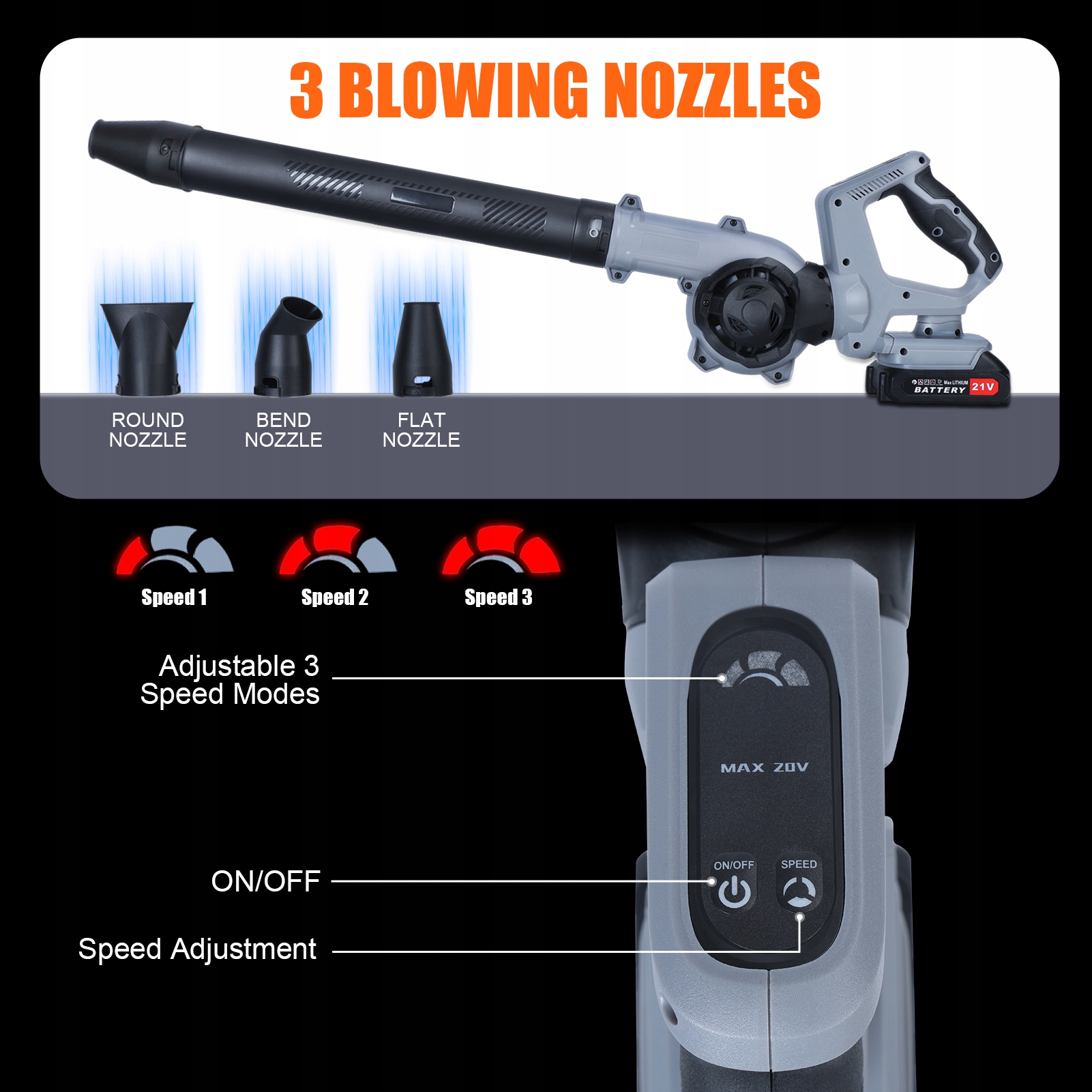 Акумуляторна повітродувка 21 В + 2 батареї, 3 режими швидкості та поворотна рука