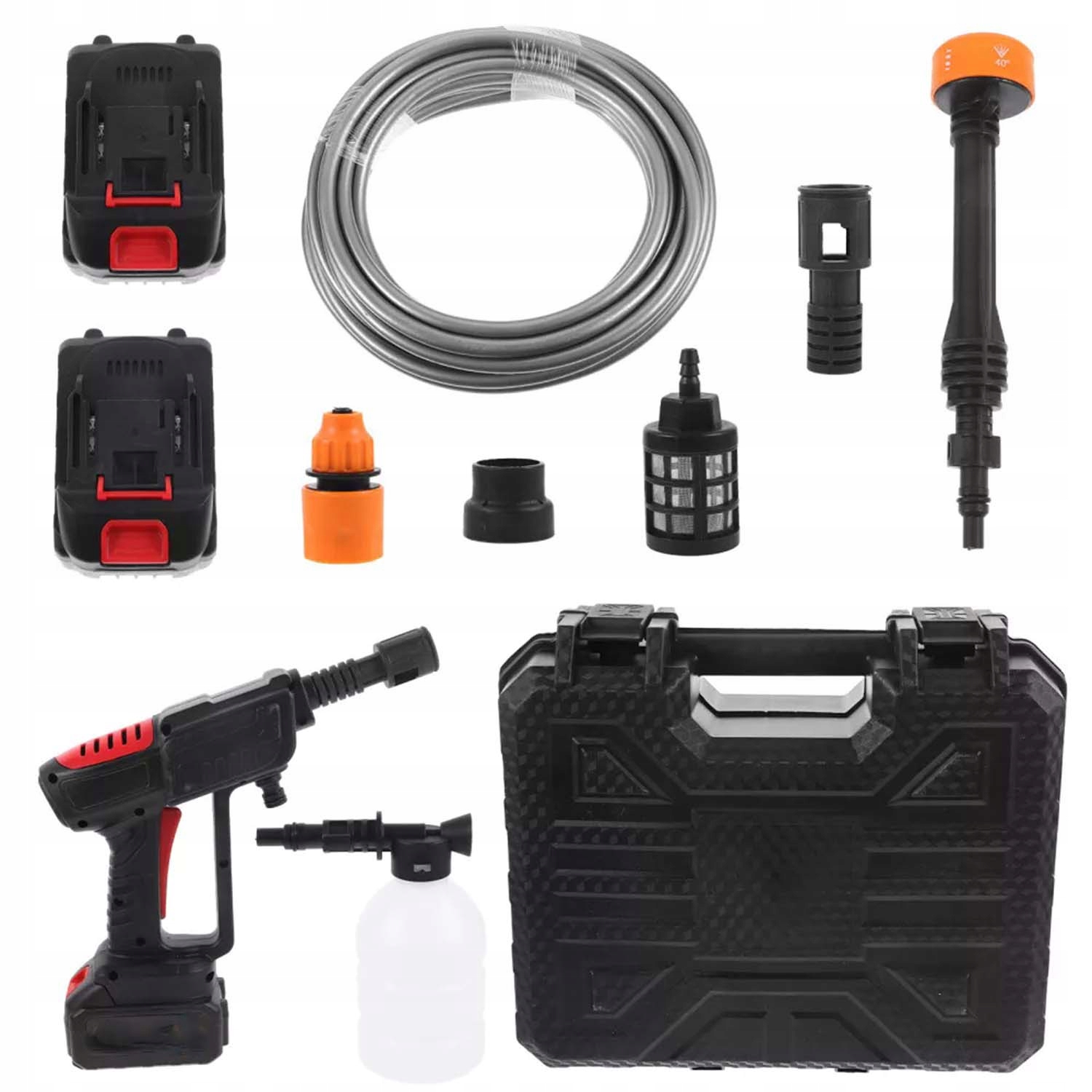 Насадка для режиму 0°/15°/25°/40°/душ/душ. Чудово підходить для поливу рослин, чищення транспортних засобів, садових інструментів, велосипедів, човнів, вікон, стін, підлоги, ванн, басейнів, дверей, під’їздів, парканів і кутів, які важко очистити вручну. Мийка високого тиску оснащена контейнером для піни для швидкого спінювання, що полегшує очищення автомобілів і плям, таких як вікна та двері.