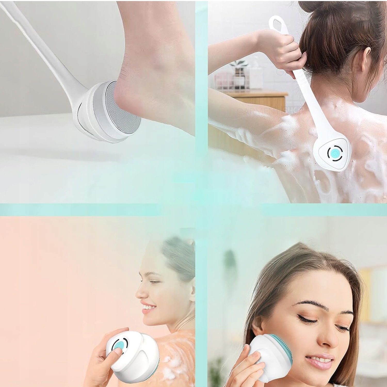 - Це електрична щітка для ванни 5 в 1, оснащена 5 знімними головками для щітки, включаючи щітку для глибокого очищення, силікон щітка для чищення, зручна щітка для душу, щітка для пілінгу для ніг і щітка для грязі, які можуть ефективно видаляти забруднення тіла, жир і мертву шкіру, навіть відлущувати ваші ноги.