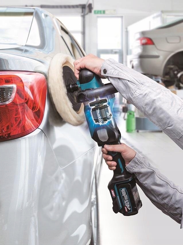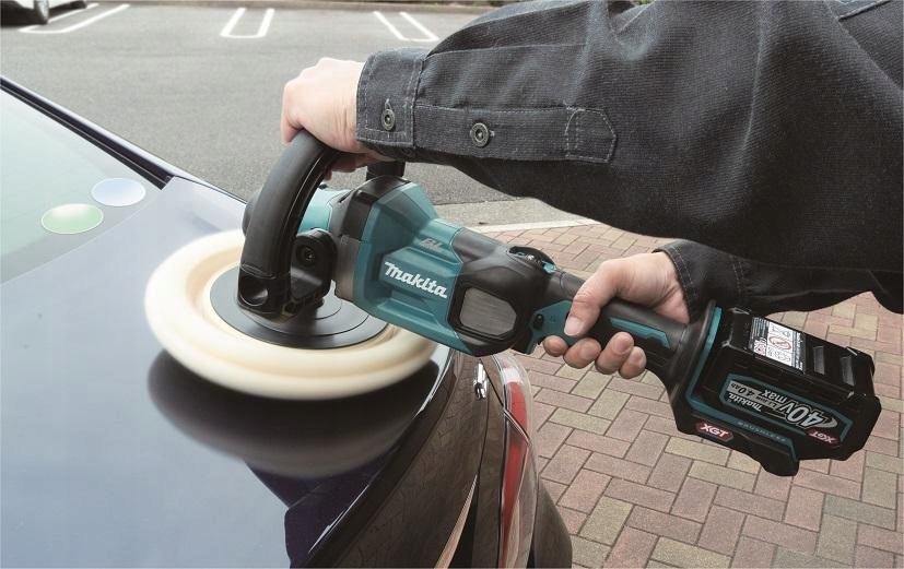 Полірувальна машина PV001G має батарею, розміщену в місці, яке обмежує можливість ударів об поліровану поверхню, а крім того, кришка акумулятора покрита еластомером для захисту пофарбованих елементів. Форма передньої ручки дозволяє користувачеві легко керувати пристроєм на оброблюваній поверхні. Він має регулювання швидкості за допомогою ручки налаштування та тригера перемикача під час роботи. Додатковий замок перемикача захищає від випадкового включення. До 42 хвилин роботи на одному заряді акумулятора BL4025.