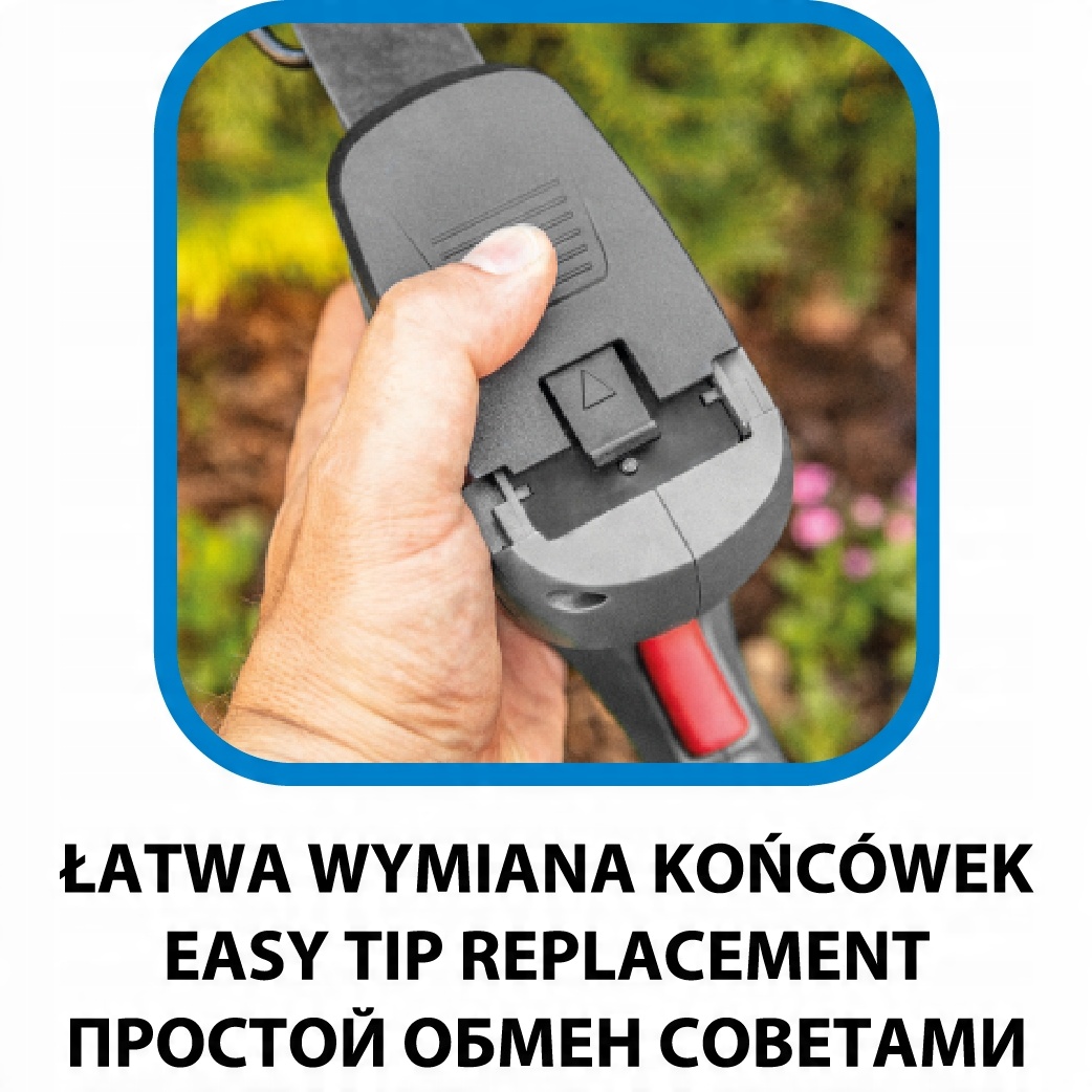 Тример характеризуєтьсялегкою заміною наконечників. Вбудований замок-перемикач і прогумована ручка забезпечують безпеку, а м'яка рукоятка підвищує комфорт використання пристрою.