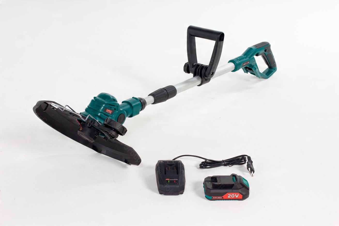 Ефективний акумуляторний тример із потужним двигуном 20 В постійного струму з діаметром стрижки до 28 см. У комплект входить акумулятор 2,0 А·год і зарядний пристрій.