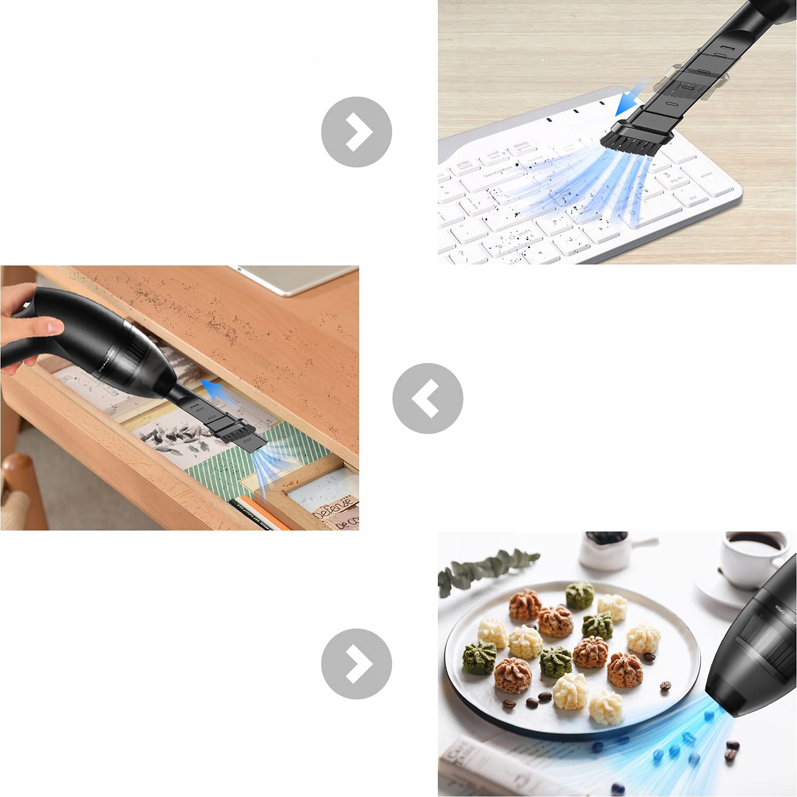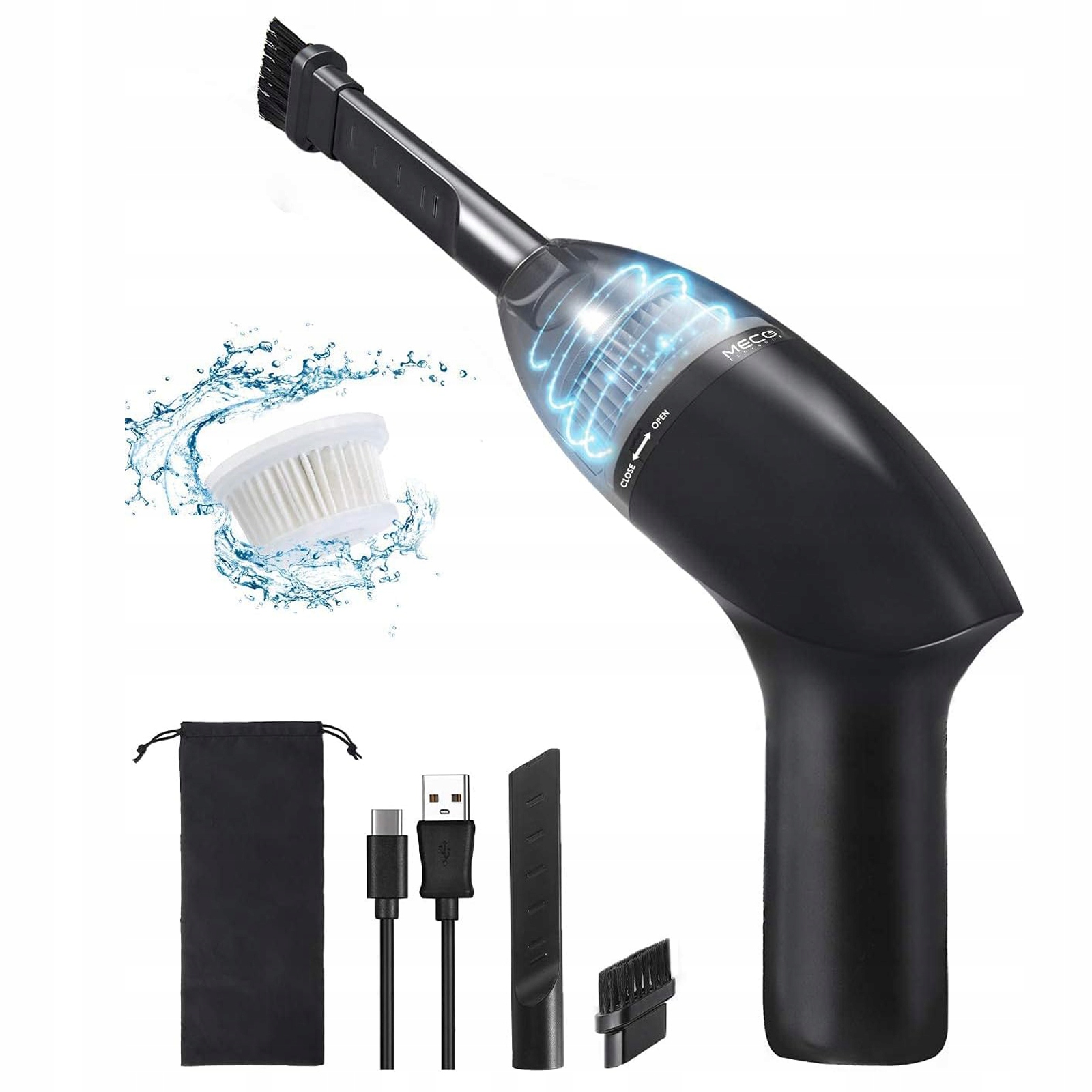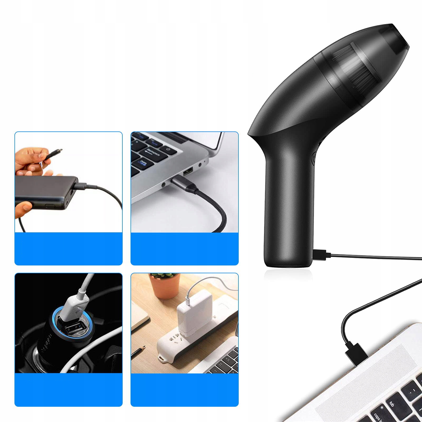 - Ручний пилосос має сильну всмоктувальну потужність 4 кПа та може прибирати пил, волосся та бруд і сміття з ноутбуків, піаніно, комп’ютерів, автомобілів, косметичних сумок, приміщень для тварин тощо.