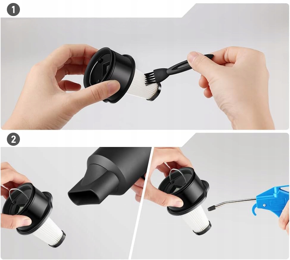 Набір включає щітку для пилу 2 в 1 і щілинну насадку, ідеально підходить для чищення автомобілів, віталень, кухонь, спалень, килимів, підлоги, офісні клавіатури та багато інших поверхонь.