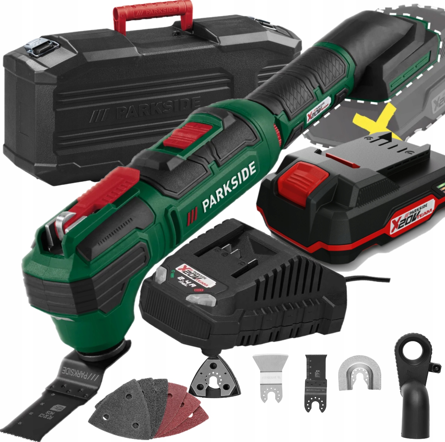 - Акумуляторний багатофункціональний інструмент PARKSIDE® 20 В PAMFW 20 -Li C3 з акумулятором ємністю 2 А·год і зарядним пристроєм 65 Вт