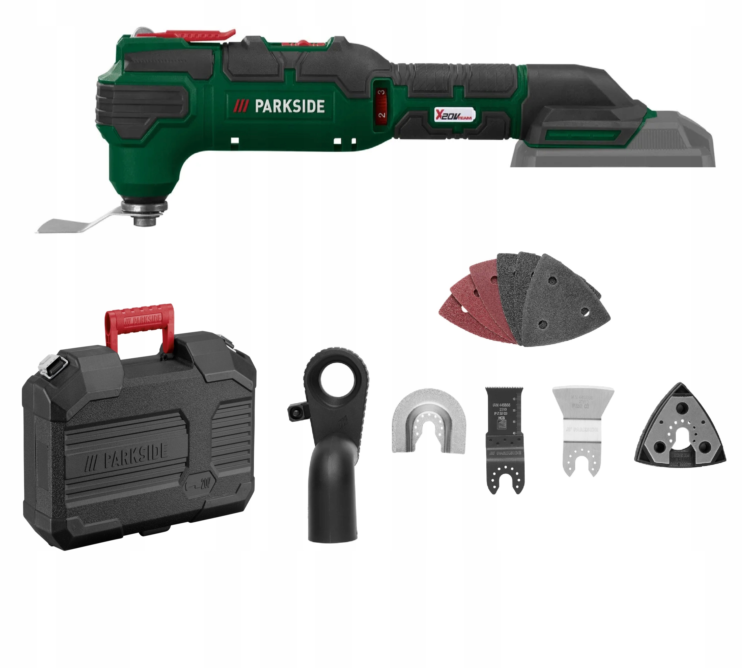 - Аксесуари: 1 диск для глибокого різання HCS, 1 алмазний диск, 1 скребок, 1 дельта-шліфувальний диск, 1 адаптер для зовнішнього пиловідведення, 6 шліфувальних аркушів (3 x дерево - зернистість 60/80/120, 3 x метал - зернистість 60/80/120)