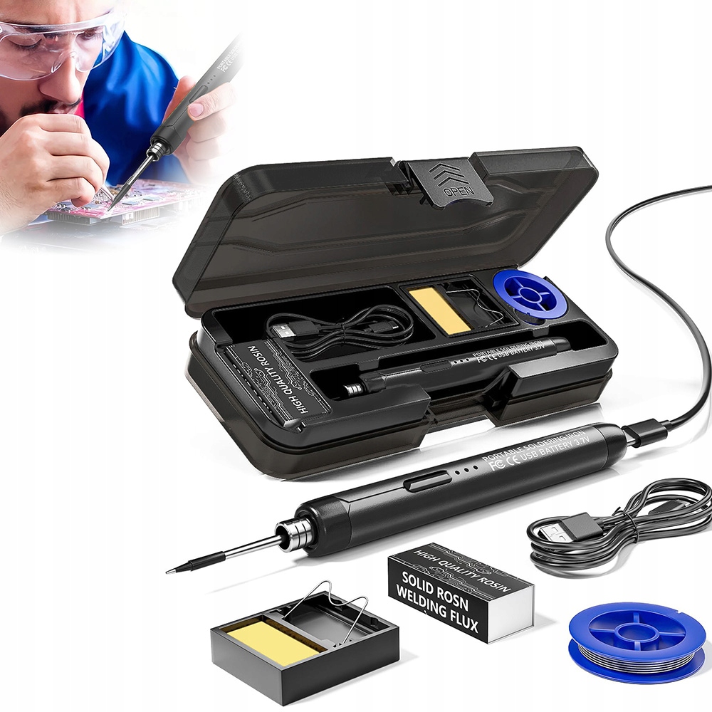 Набір для паяння, бездротовий паяльник, швидкий нагрів за 7 секунд (200-400°C), автоматичний сплячий режим, 3-х ступеневе регулювання температури, нагрівальна жила, паяльний кабель, каніфоль, підставка для паяльника, футляр, паяльник для точного ремонту