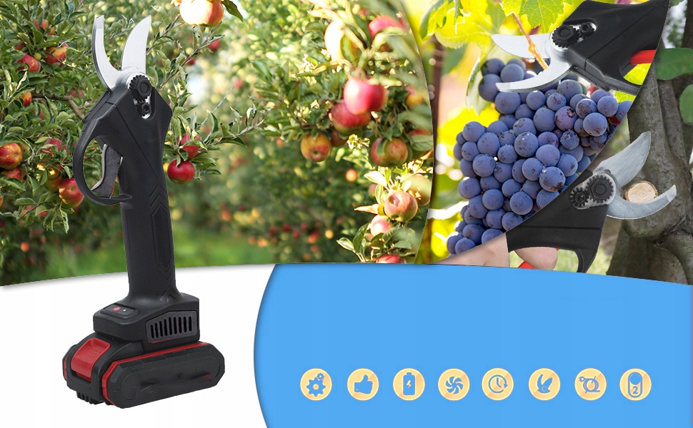 🌿Широке застосування. Цей електричний секатор має широкий спектр застосувань , можна використовувати для всіх видів садів, парків, ферм, великих пасовищ, фруктових садів, теплиць, можна зрізати виноград, вишні тощо.