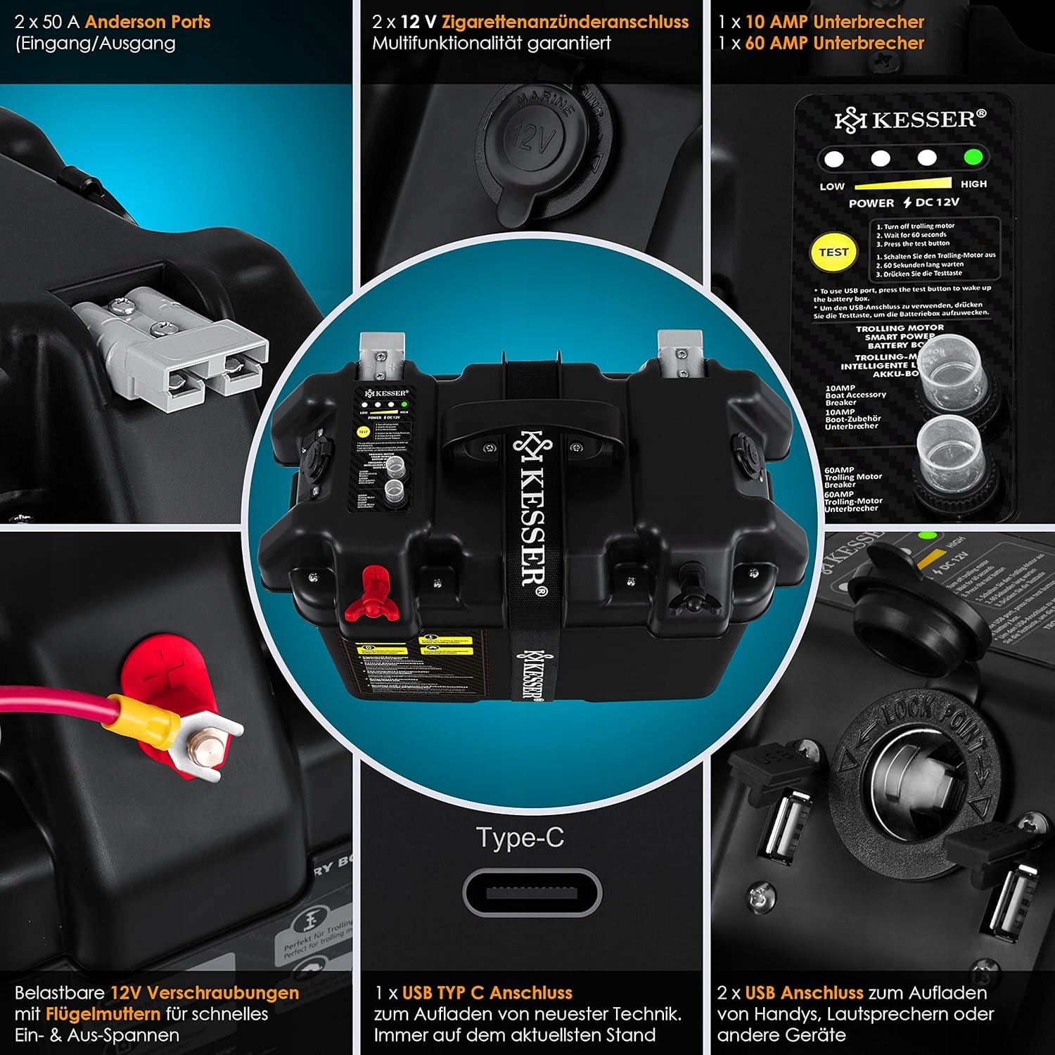 Наша високоякісна батарейна коробка містить численні з’єднання для електричних пристроїв. 2 x 50 A порти Anderson (вхід/вихід), 2 x 12 V порти автомобільного прикурювача для гарантованої багатофункціональності, 1 x 10 AMP розетка, 1 x 60 AMP розетка, 2 x USB-роз’єми, потужні гвинтові роз’єми 12 V з барашковою гайкою для швидкого вставлення та видалення, 1 x роз’єм USB типу C – для заряджання за найновішими технологіями, ви завжди в курсі подій. . Завдяки цьому ви ідеально підготовлені до кожної поїздки.