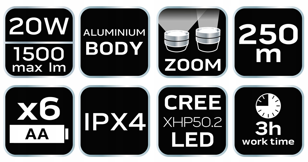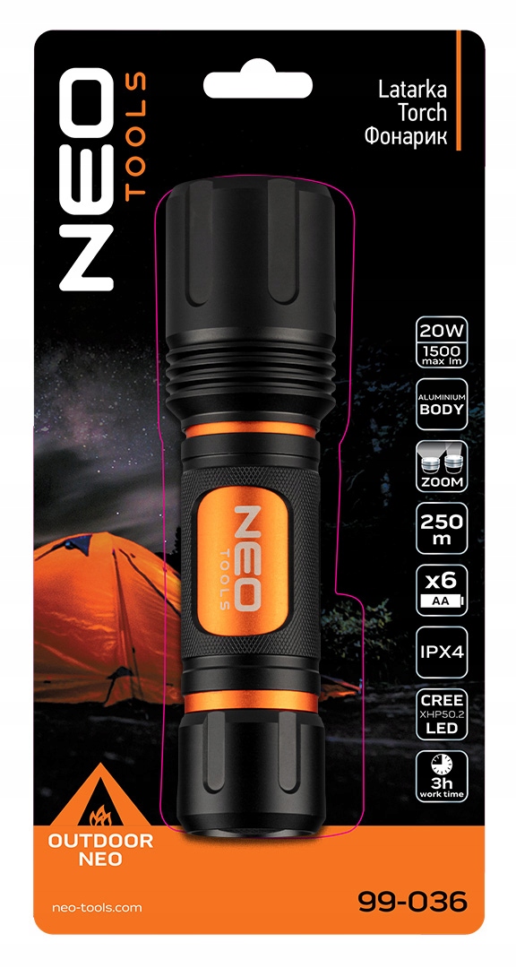 Нео-акумуляторний ліхтарик (посилання 99-036) із Zoom оснащений сучасними світлодіодами Cree XHP50.2 світлодіоди з легким потоком 1500 люменів і потужністю 20 Вт. Ліхтарик живиться від 6 батарейних батарей (не включається). Тіло було зроблено з алюмінію. Ліхтарик має 3 функції освітлення: 100%, 20% та строб.