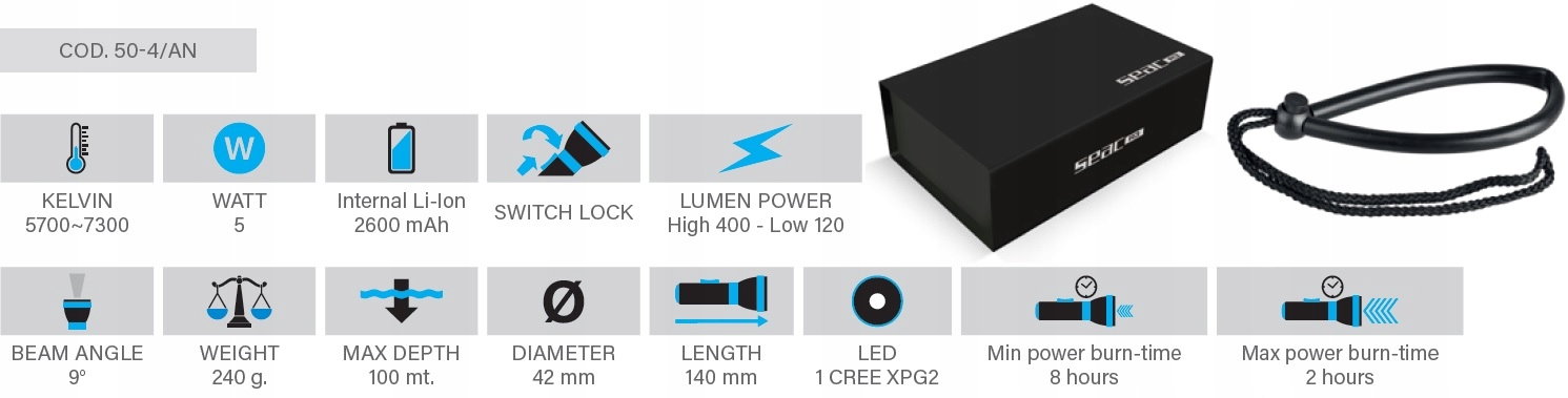 Внутрішній літій-іонний акумулятор 18650 можна заряджати за допомогою зовнішнього зарядного пристрою Micro-USB, що входить у комплект. Представлені дві інноваційні функції проти затоплення: магнітний перемикач з електричними імпульсами, що зберігаються в окремій камері, і 3-точкове радіальне ущільнення, яке замінює традиційні ущільнювальні кільця. Seac Sub знову реалізував високоякісний продукт італійського дизайну, ергономічний, алюмінієвий сплав, оптичне загартоване скло, стійке до ударів і тиску. Максимальна робоча глибина 100 м/300 футів.