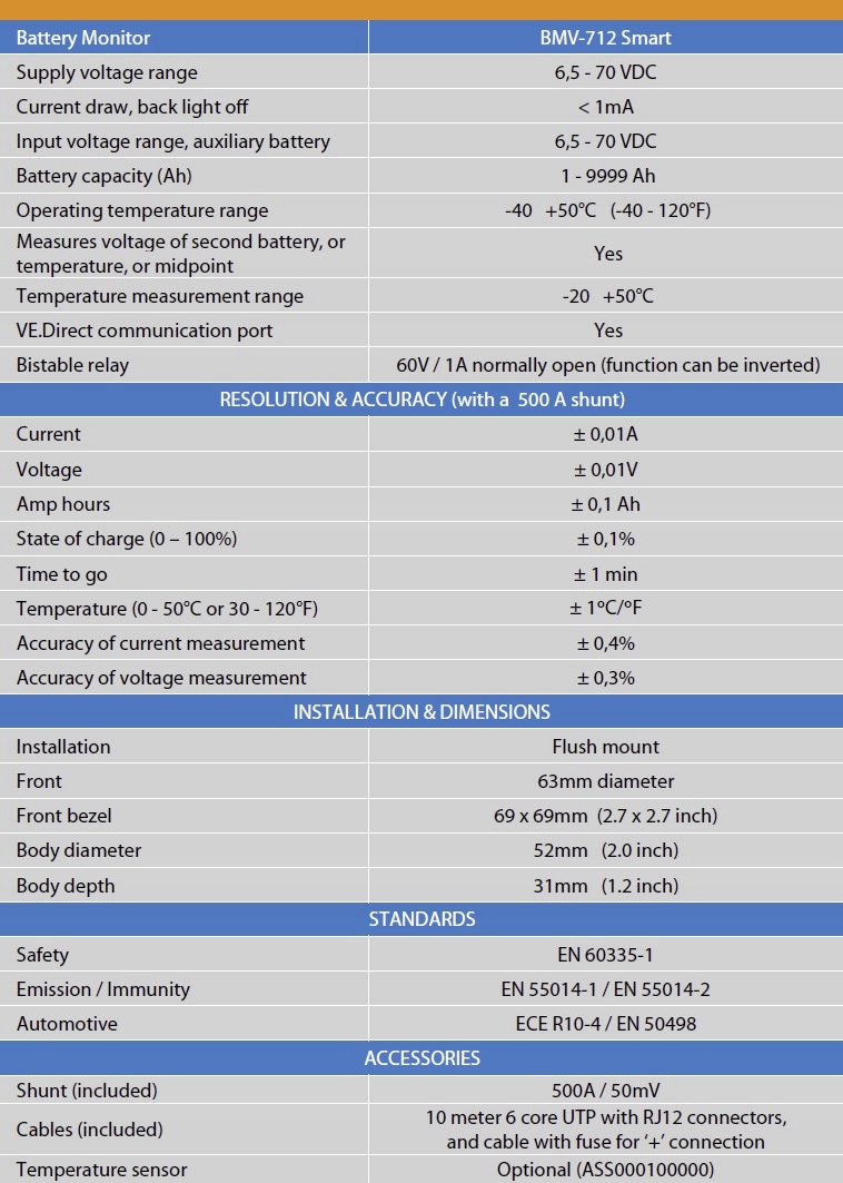 • просте підключення: BMV-712 Smart постачається з шунтом, 10-метровим кабелем UTP RJ12 і 2-метровим кабелем для підключення акумулятора з вбудованим запобіжником. Додаткове обладнання не потрібне.