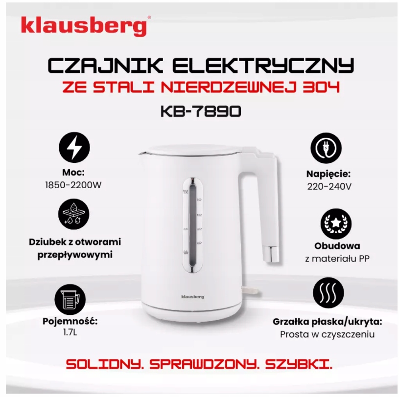 Стильний і елегантний електрочайник Klausberg об'ємом 1,7 л - це поєднання сучасного дизайну і високої функціональності. Виготовлений з нержавіючої сталі 304 з матово-білим покриттям, він стане справжньою окрасою будь-якої кухні.