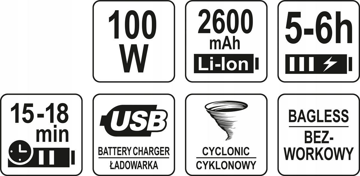 100 Вт вакуумний очищувач автомобіля та дуже великий вакуум 5,5 кПа рідко зустрічаються в бездротових моделях. Додані аксесуари сприятимуть комплексному пилососу автомобіля, також важко дістатися до місць та куточків. Комплект включає, серед інших, підлогу вакуумний комплект, завдяки якому автомобіль буде працювати як у машині, будинку, так і у відпустці. Металевий фільтр HEPA гарантує ефективну фільтрацію повітря та зменшення забруднення. Ефективний акумулятор Li-Ion 2600mAh дозволяє безперервну роботу до 15-18 хвилин