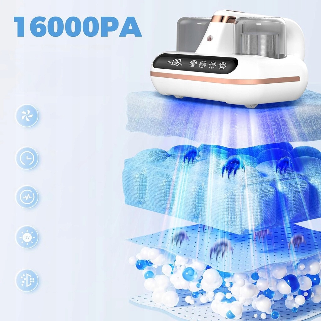 - Використовуючи ультрафіолетове світло 253,7 нм,фізичні ультразвукові хвилі, потужні високочастотні удари, глибоке ураганне всмоктування, супервсмоктування та метод швидкого очищення 5-в-1, ви можете досягти найкращих результатів чищення матраца і забезпечте всебічне та здорове домашнє середовище.