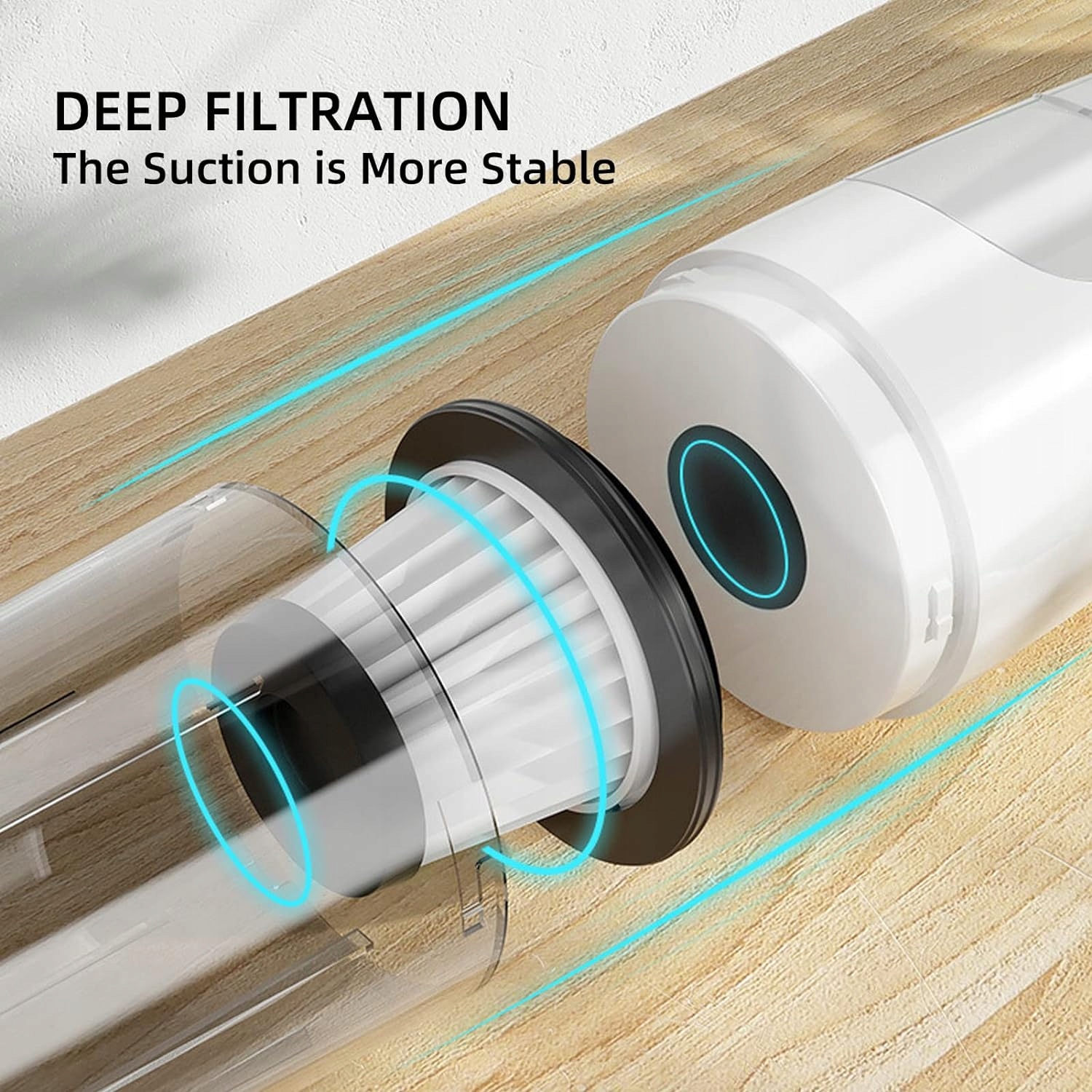 Напівпрозорий. Ручний пилосос має напівпрозору конструкцію без мішка, його легко обслуговувати та чистити. Після використання він повертає пил і сміття від фільтра для стабільної потужності всмоктування. Бездротовий Завдяки своїй бездротовій конструкції цей пилосос ідеально підходить для швидкого прибирання та видалення пилу та бруду, що утворюється в будинку, досягаючи важкодоступних місць, таких як диванні подушки та полиці. Подовжувач Ручний пилосос із подовжувачем, вам не потрібно нахилятися під час використання, він позбавить вас від турбот і зусиль, його легко переносити та маневрувати навіть у тісних місцях. Висока потужність Ручний пилосос оснащено потужним двигуном 120 Вт із потужною потужністю всмоктування 19800 Па, що ідеально підходить для домашнього офісу, додає додатковий рівень універсальності пилососенню та пилососенню оббивки. Довговічна вбудована літієва батарея ємністю 6000 мАг, стабільна робота протягом 60 хвилин без необхідності кидати сигарету, не шкодить автомобільному акумулятору, сміливо використовуйте.