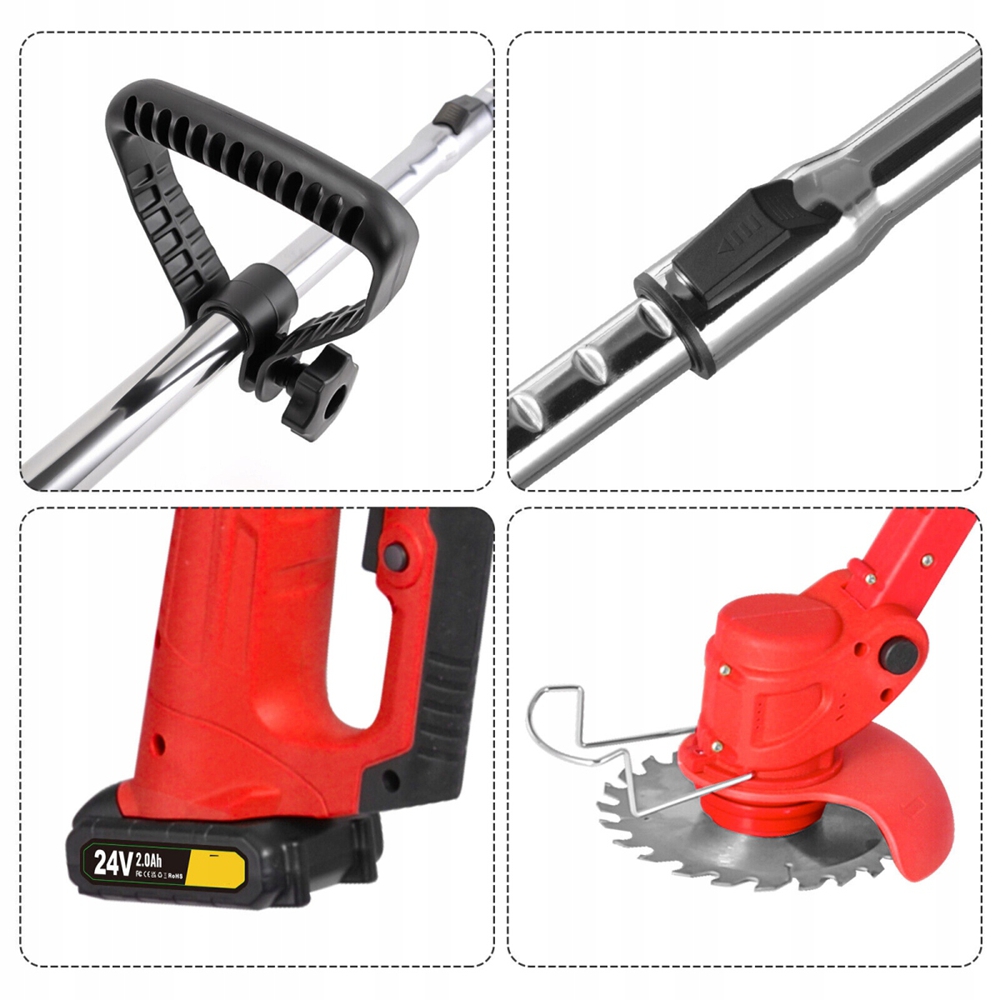 - - Оснащений трьома типами лез, він може легко впоратися з різними умовами: кругле лезо з нержавіючої сталі призначене для зрізання твердих гілок і кущів, довге лезо з нержавіючої сталі для різання більш грубої та більш грубої трави, а пластикове лезо підходить лише для різання дуже дрібної трави.