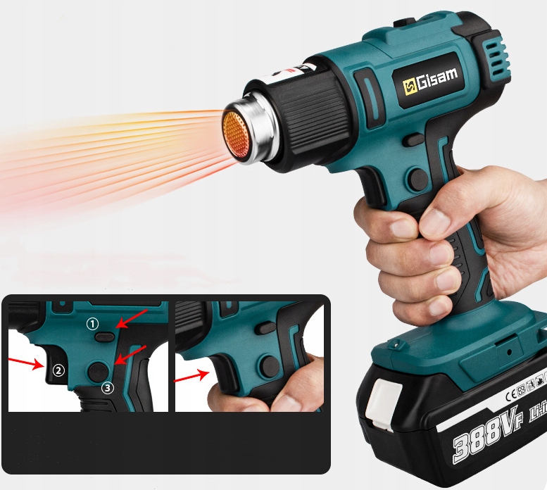 - Широке застосування, ідеально підходить для обгортання автомобілів, пом’якшення проводів, усадки пластикової плівки, складання електронних компонентів, розчинення труб, видалення стара фарба, функція розморожування.