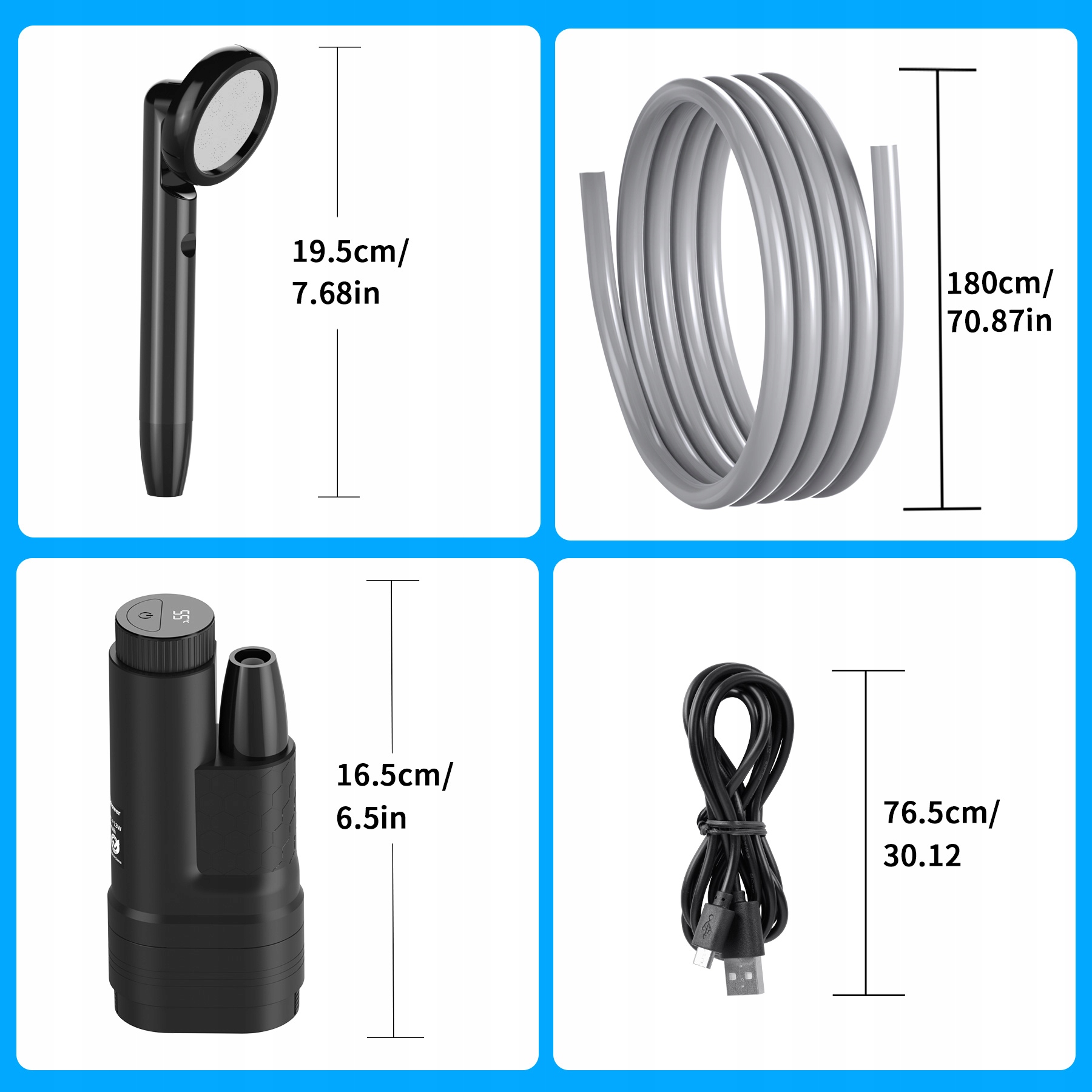 Душ має вбудований літієвий акумулятор 4000 мАг, повний зарядка займає всього 5-7 годин. Його можна використовувати безперервно протягом приблизно 60-90 хвилин для кількох людей під душем, на відкритому повітрі ви можете насолоджуватися найдосконалішим досвідом прийняття душу. Коли акумулятор розряджений, його можна заряджати через автомобільний адаптер/комп’ютер/мобільний пристрій тощо за допомогою USB-кабелю для заряджання 5 В, який входить у комплект.