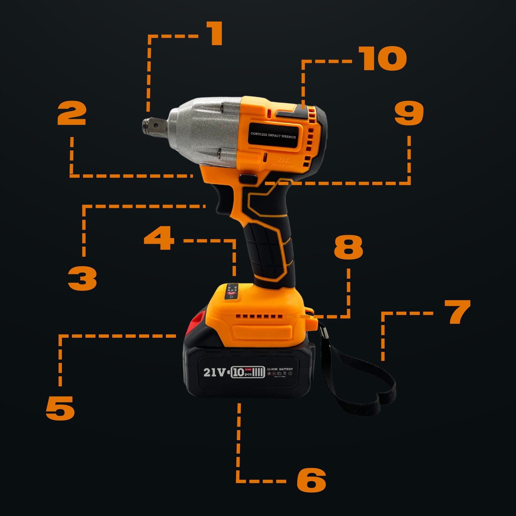 Матеріал інструменту з високою твердістю стійкий до ударів і вібрації. Безщітковий двигун забезпечує високу потужність з максимальним крутним моментом 350 Нм і швидкістю 2200 об/хв. Прилад має ррегульовану швидкість: два режими швидкості на вибір. Ви можете вільно перемикатися між високою та низькою швидкостями, торкаючись кнопки. Вентиляційні отвори ефективно розсіюють тепло, тому ви можете використовувати ударний гайковерт протягом тривалого часу без ризику отримати опіки.