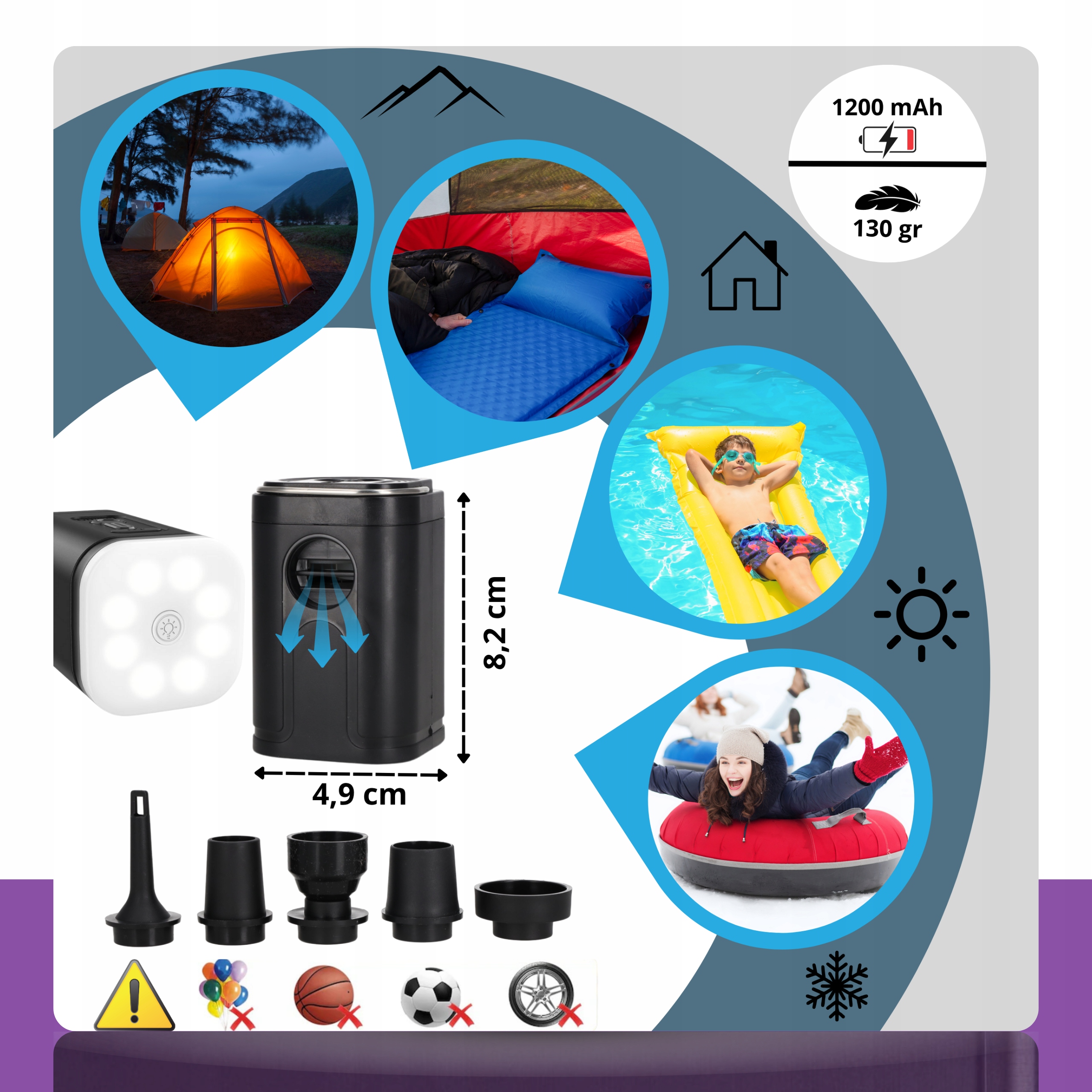 ✅ Компактний і легкий | ✅ 5 насадок у комплекті та універсальні у використанні ✅ Сильне надування та здування | ✅ Зарядка через USB| ✅Світлодіодний ліхтарик для кемпінгу | ✅ Ідеально підходить для будь-якої пори року |