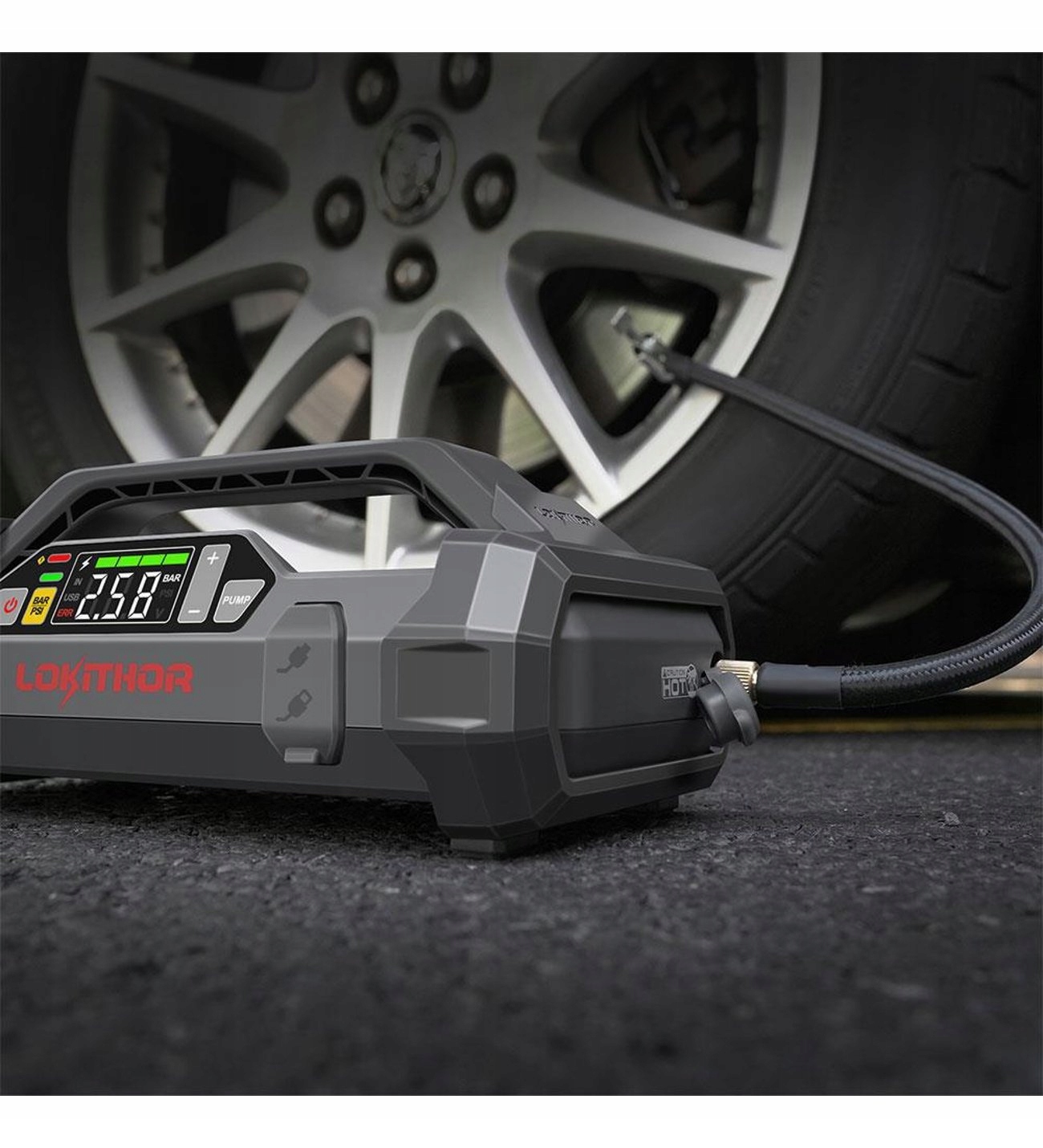 Lokithor Battery/Jump Starter – це багатофункціональний інструмент, за допомогою якого ви можете накачати шини, зарядити телефон, запустити двигун і освітлювати територію
